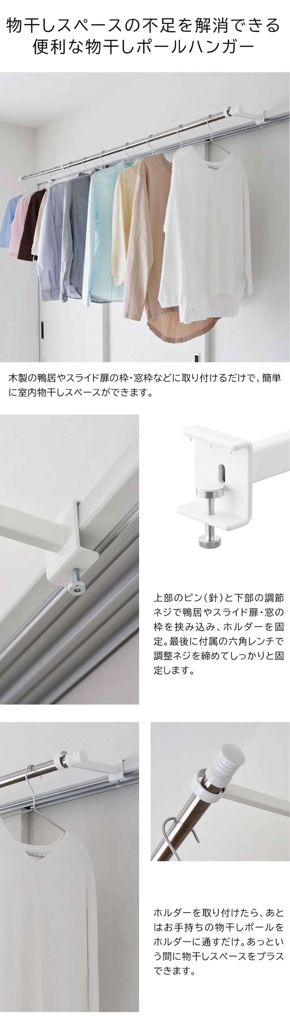 鴨居、窓枠などに簡単取り付け。スライド扉やカーテンを閉めた状態でも干せる便利な室内物干しポールホルダー。奥行きがワイドなので、カーテンやドアに洗濯物が当たって乾きムラになるのを防ぐことができ、ピンチハンガーも掛けやすいです。ポールを差し込むだけで室内物干し場ができます。枠の上部にピン(針)で刺し込んで落下を防ぎます。付属の六角レンチを使って、調節ネジで枠にしっかり固定できます。