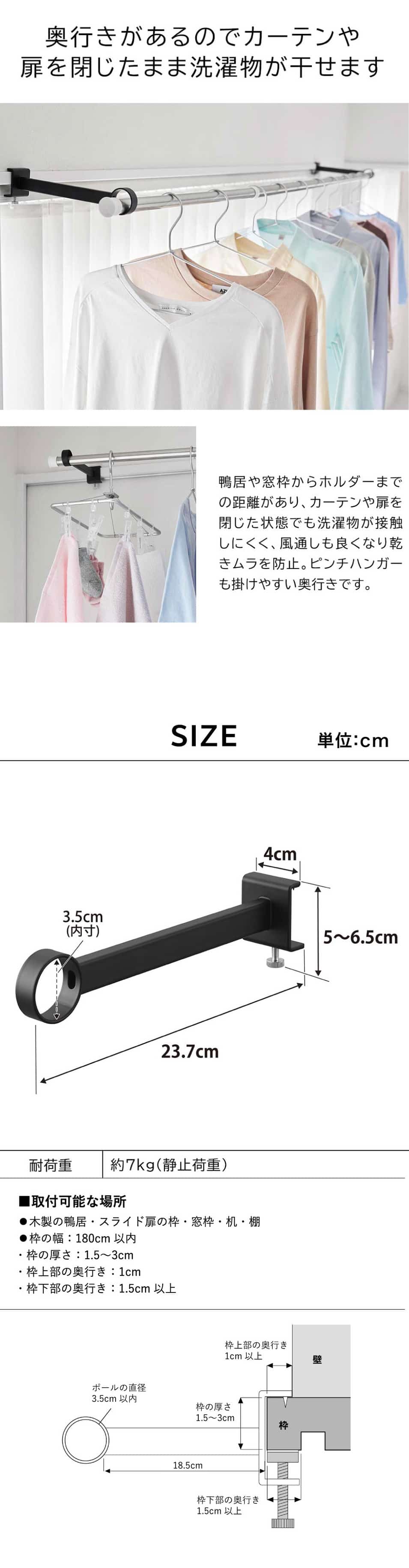 ■取り付け可能な場所 木製の鴨居・スライド扉の枠・窓枠・机・棚 枠の幅:180cm以内 枠の厚さ:1.5~3cm 枠上部の奥行き:1cm以上 枠下部の奥行き:1.5cm以上 *物干しポールは付属しておりません。 |