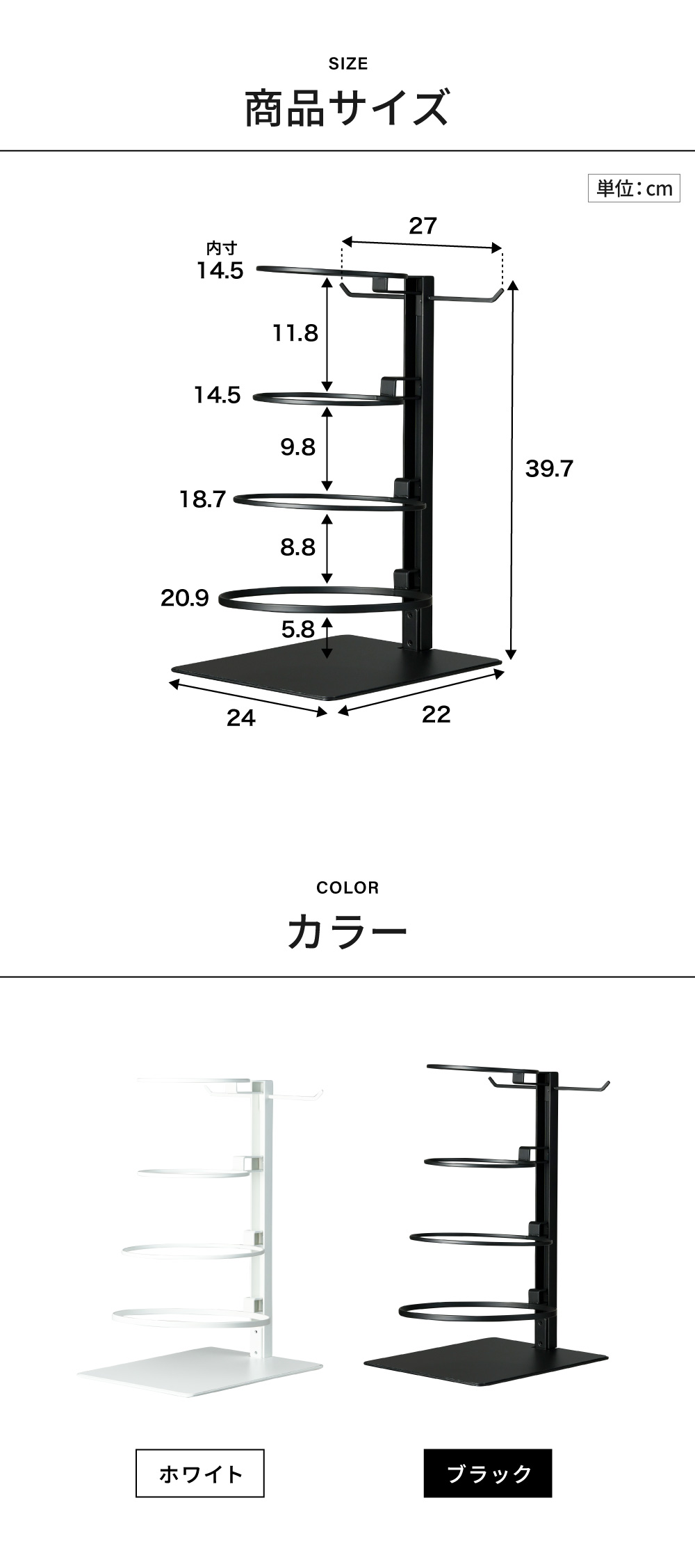 ●内寸: 置き台(1):直径14.5cm、置き台(2):直径14.5cm・高さ 最大11.8cm、 置き台(3):直径18.7cm・高さ 最大9.8cm、 置き台(4):直径20.9cm・高さ 最大8.8cm、 台座:幅24cm×奥行き21.6cm・高さ 最大5.8cm