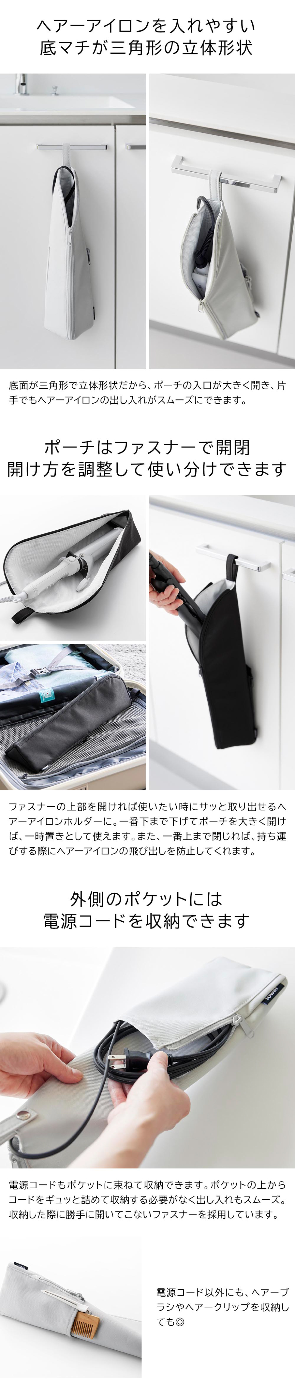 ヘアーアイロンを熱いまま収納できる!吊り下げても置いても出し入れ簡単な耐熱ヘアーアイロンポーチ。吊るして浮かせることで洗面所もスッキリ。ストラップはボタン開閉式なのでタオルバーなどにも吊り下げられます。収納したヘアーアイロンはカバーで覆われているので子供やペットにも安心です。裏生地は耐熱温度300℃なので使用中のヘアーアイロンを熱いまま置いても安心。ファスナー付きポケットには電源コードが収納でき、出し入れもスムーズです。ポーチのファスナーは上まで閉まるので、持ち運びの際もヘアーアイロンの飛び出しを防止できます。