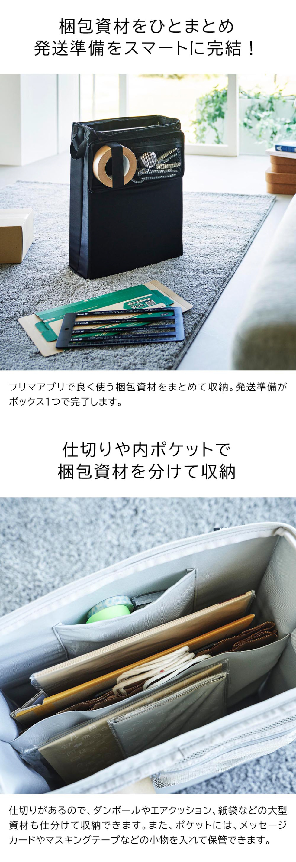 フリマアプリの発送でよく使う梱包資材を一括収納!粘着テープやカッターなどの梱包道具をまとめて保管できるボックス。蓋の内側のゴムバンドには粘着テープを収納することができます。カッターやハサミなど梱包時に使用する道具を収納できるファスナー付きポケットや小物を収納できる内ポケット、資材を種類ごとに整理しやすい仕切り付きです。幅15.5cmのスリムサイズなので省スペースに収納できます。左右に持ち手が付いているので持ち運びもラクラク。