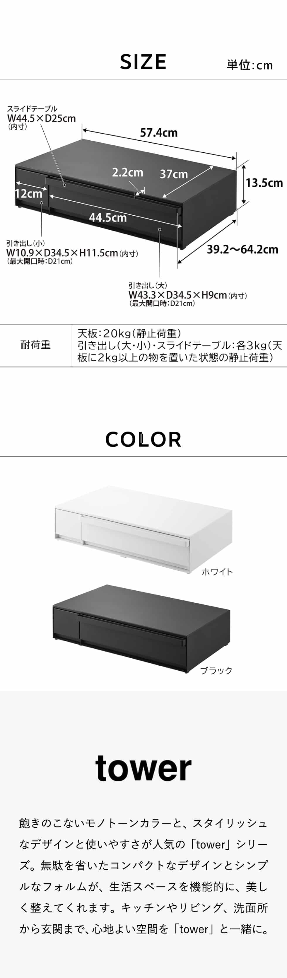 耐荷重 天板:20kg(静止荷重) 引き出し(大・小)・スライドテーブル:各3kg(天板に2kg以上の物を置いた状態の静止荷重) |