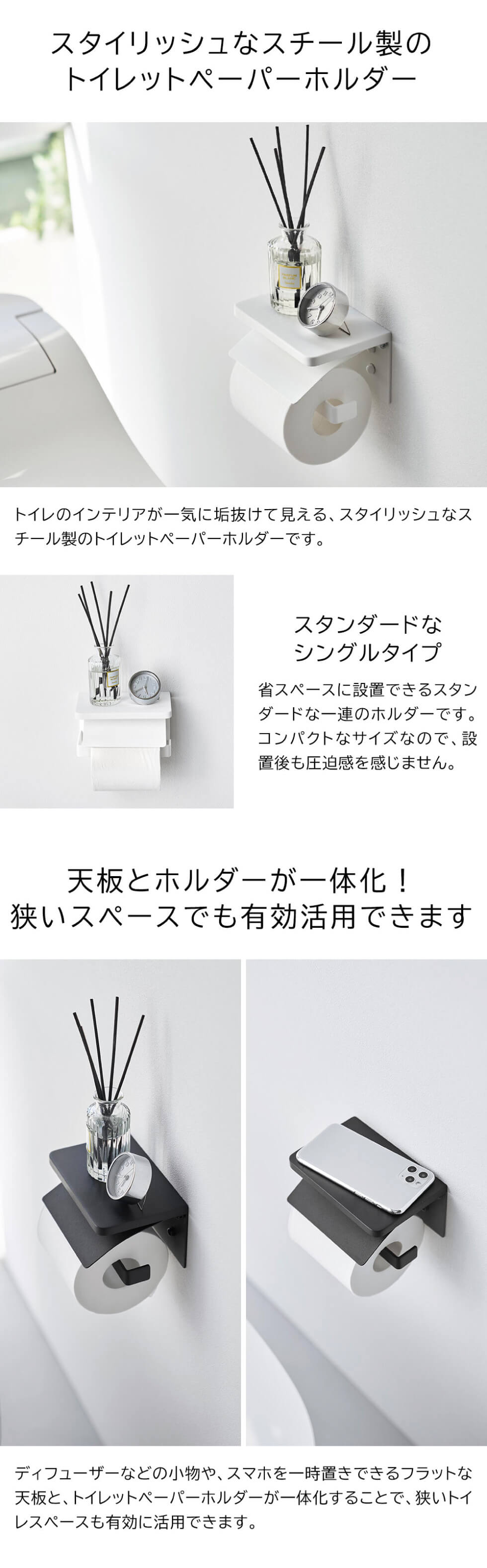 石こうボードピンで簡単に取り付けできるトイレットペーパーホルダー。天板とホルダーが一体化したシンプルなデザイン。お好みの位置に取り付けることができます。