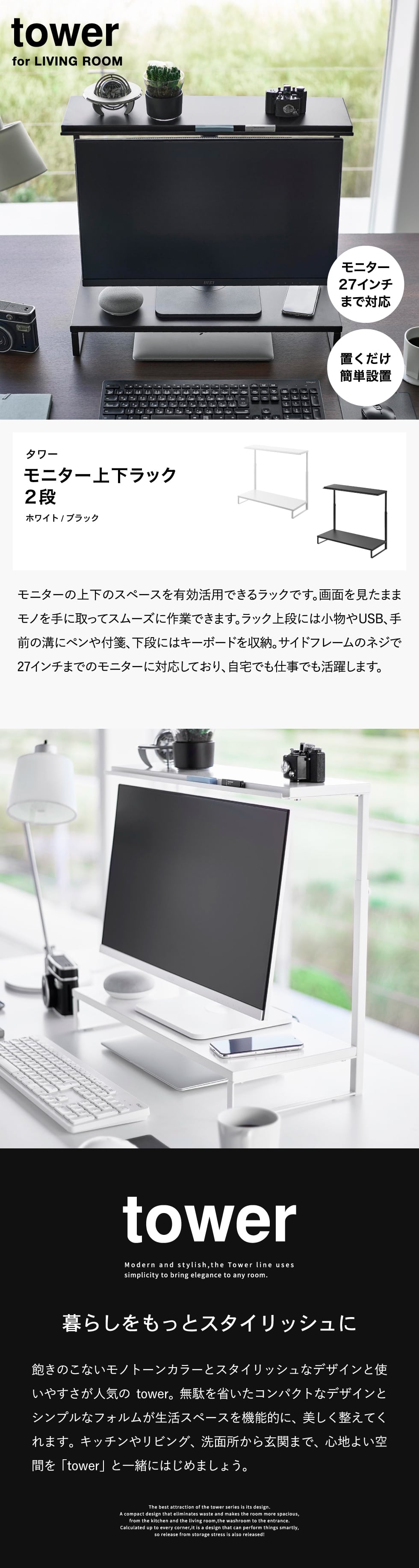 モニター上下ラック タワー 2段 山崎実業 公式 tower 1302 1303 ホワイト ブラック / パソコンラック 送料無料