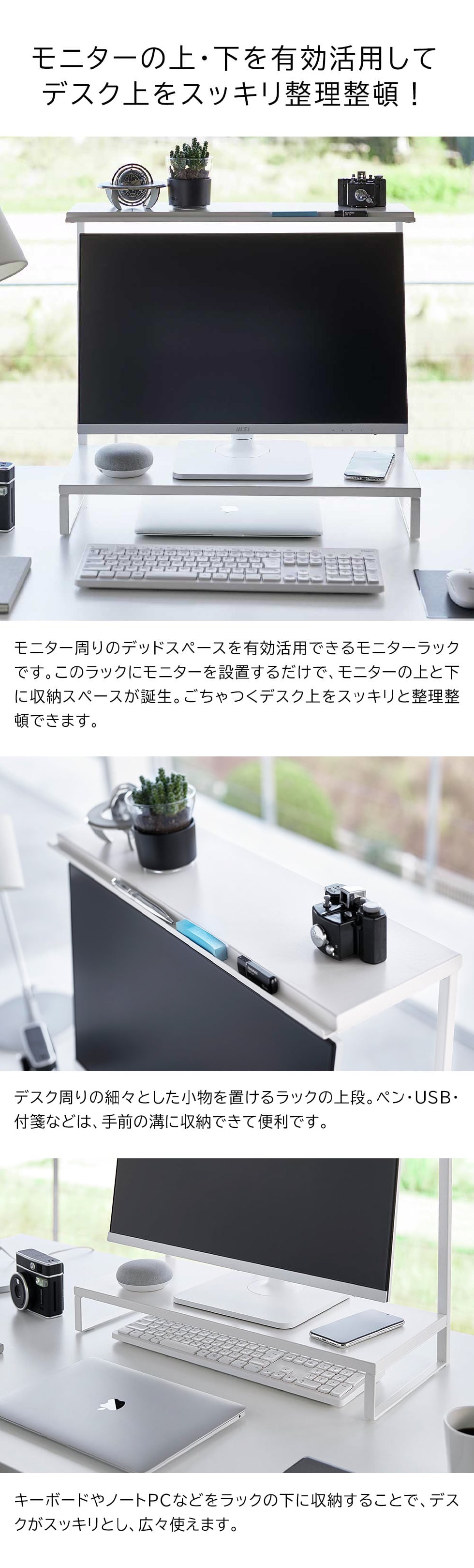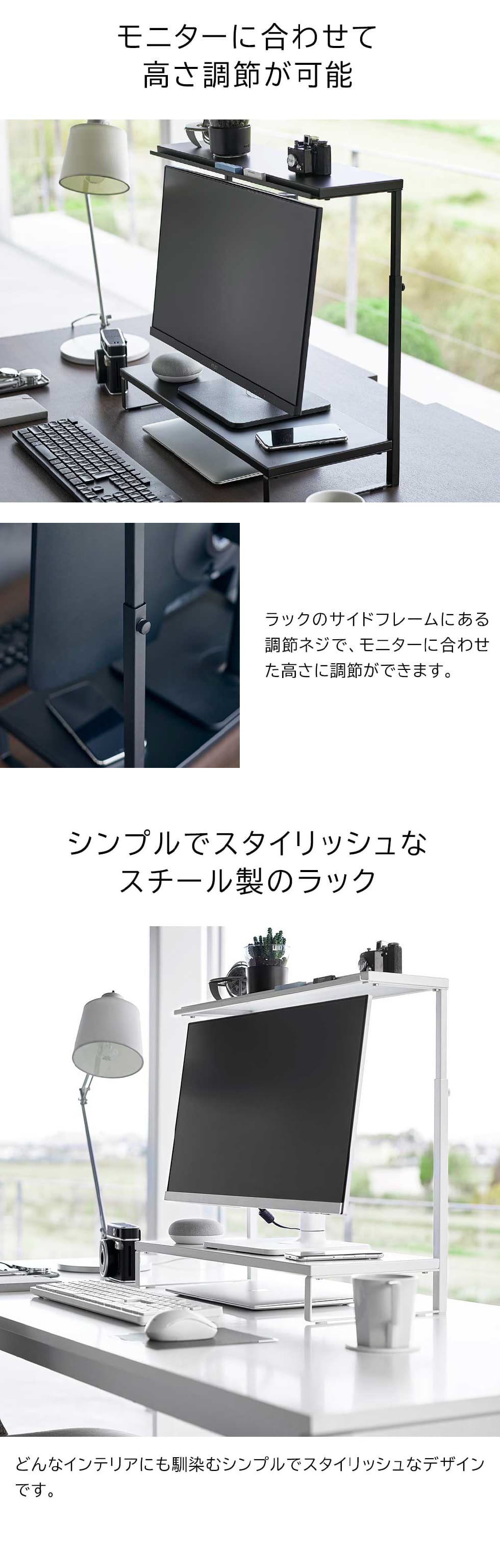 モニターの上と下を有効活用できるラック。上段のラックは小物置きに。下段のラック下にキーボードをしまえばデスク上がスッキリと広々使えます。モニターに合わせて高さ調節が可能。