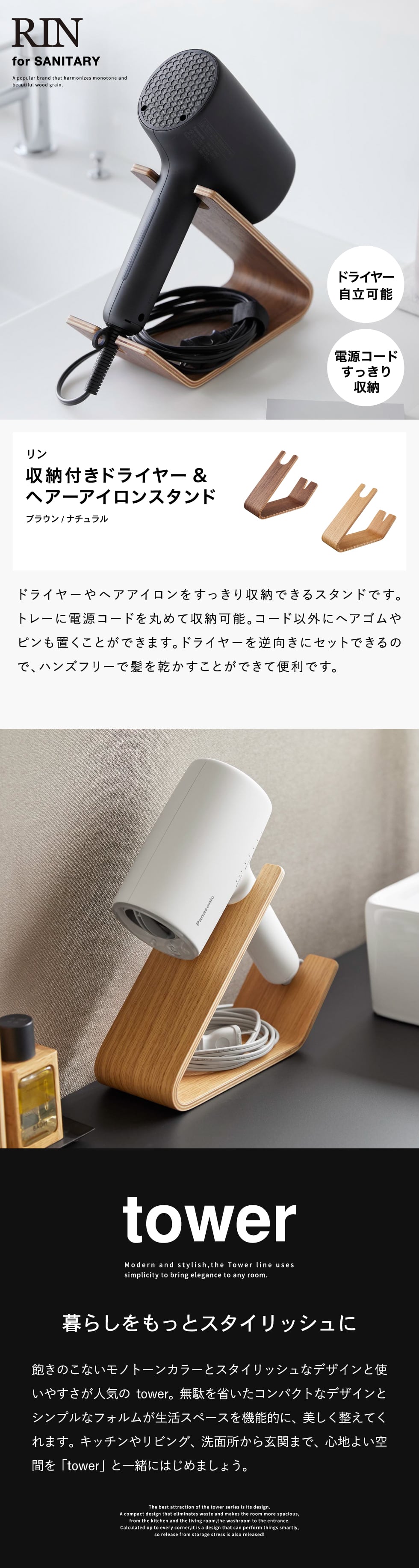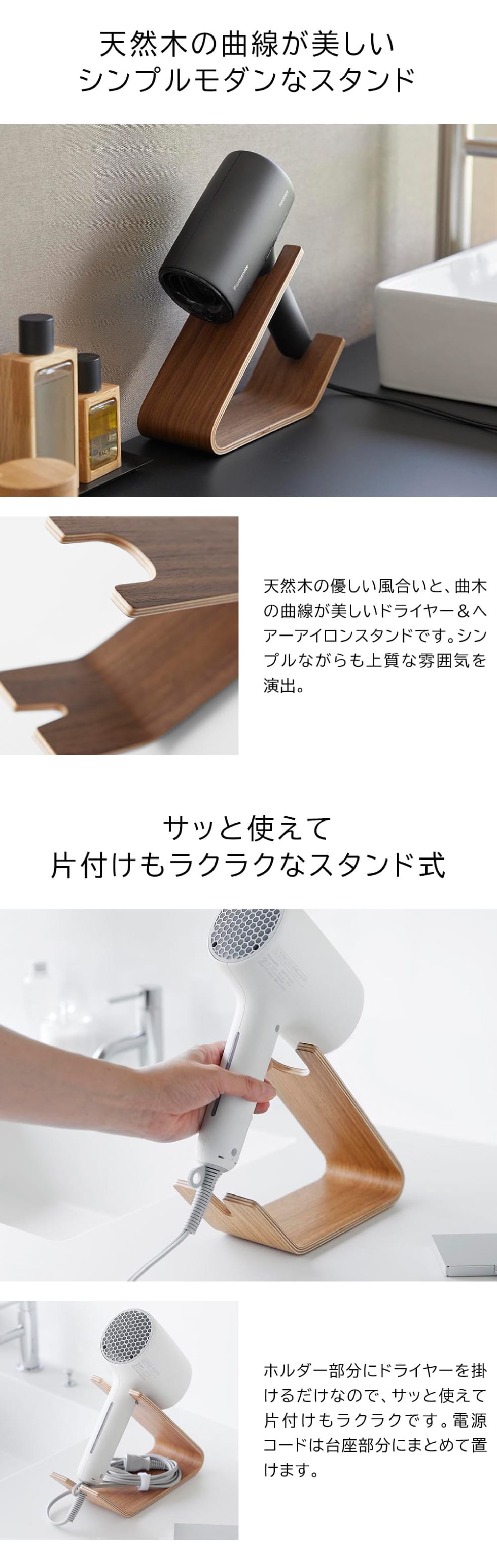 上品な木目のカーブが美しい上質なドライヤー&ヘアーアイロンスタンド。サッと使えて便利です。