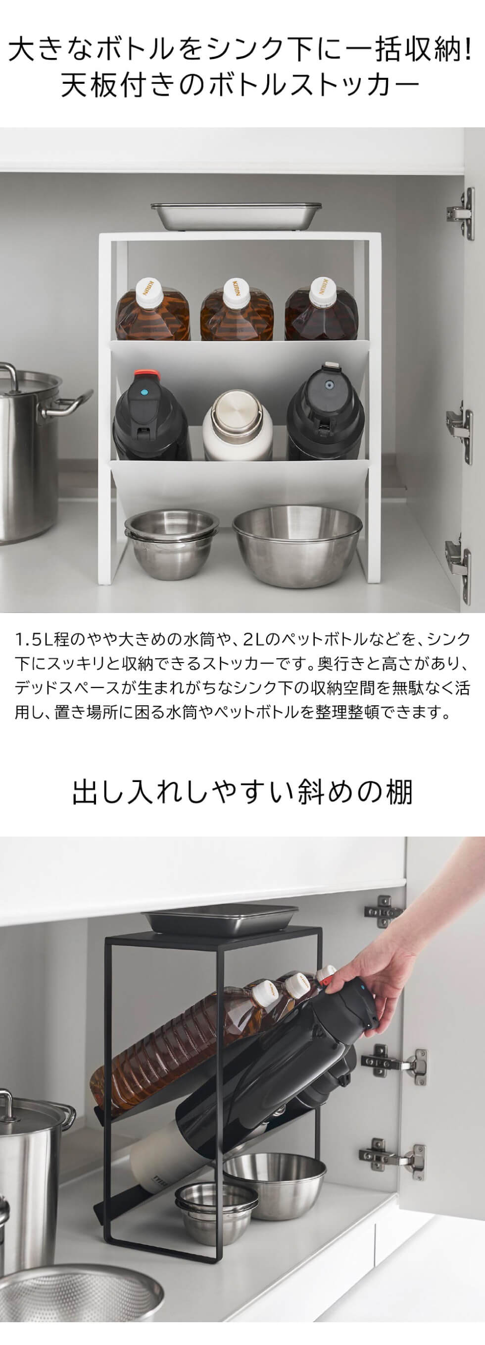 収納に困る1.5Lのスポーツジャグやペットボトルなど大きいサイズの物も収納することができる天板付きボトルストッカー。斜めになっているので出し入れしやすく、天板には小物を置くことができます。