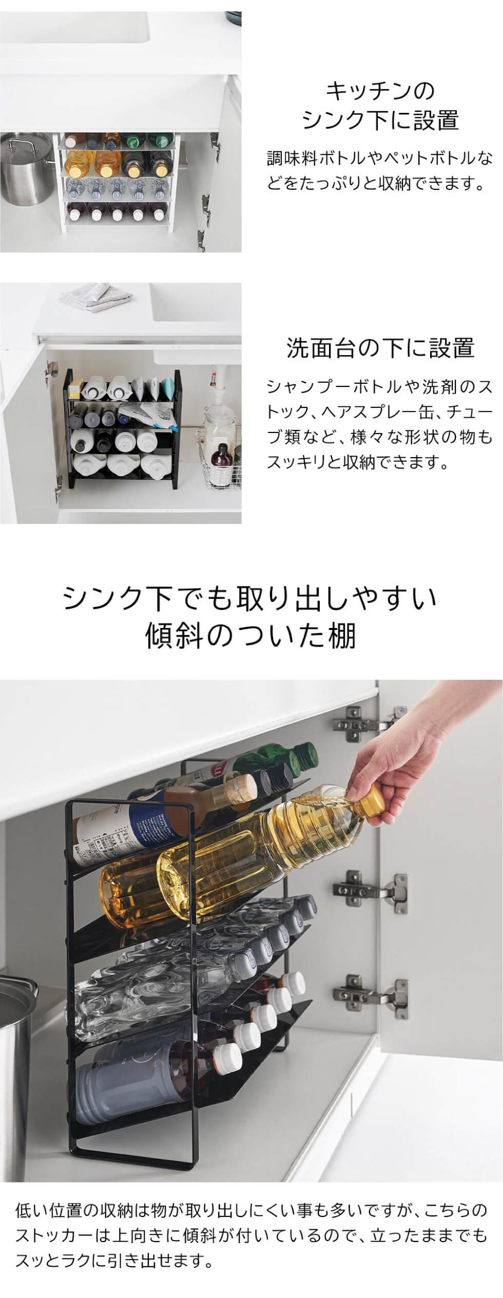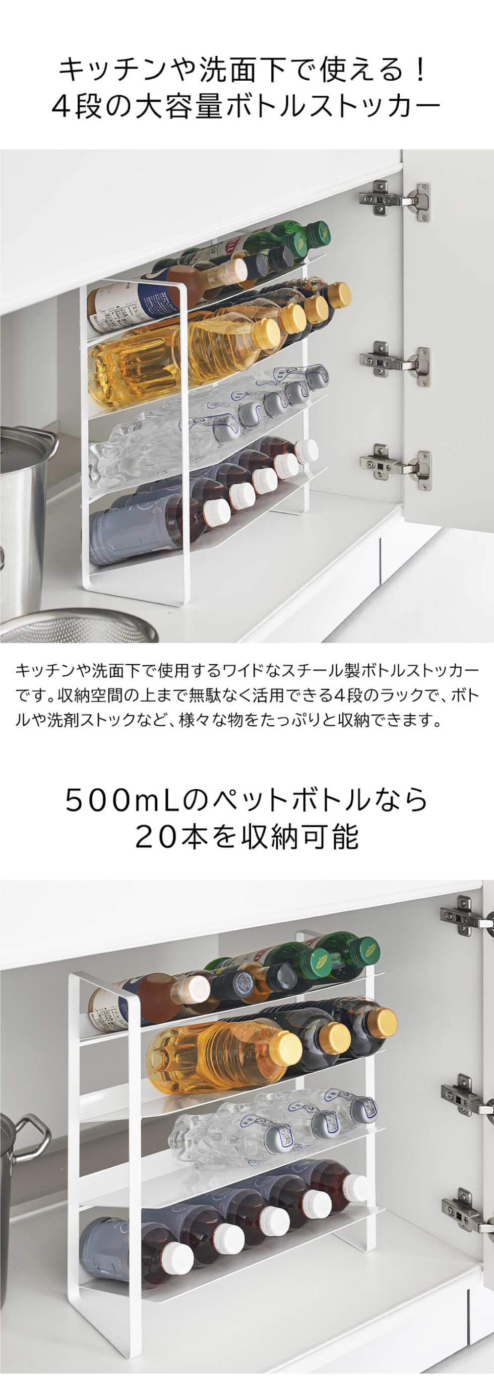キッチン・洗面下収納で使える!便利で出し入れしやすいワイドな大容量ボトルストッカー。斜めになっているので出し入れしやすく、500mLのペットボトル20本が収納可能。