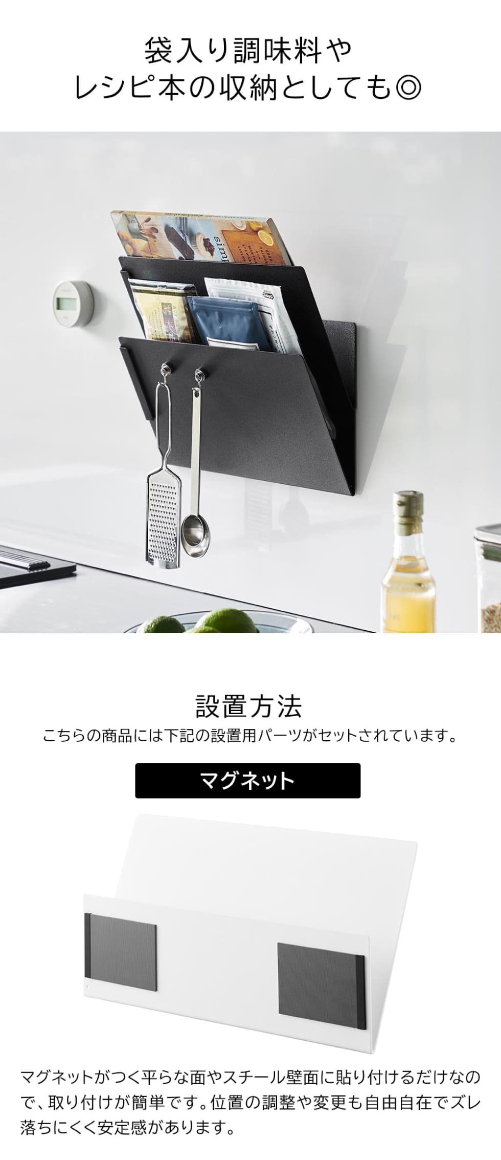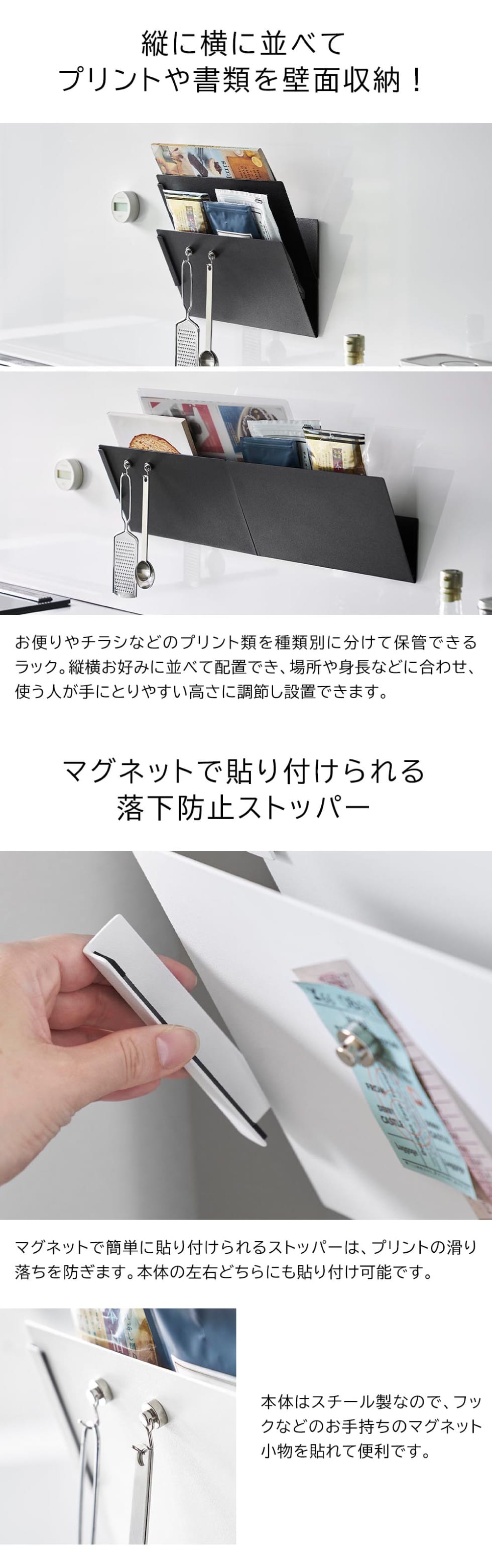 マグネットで簡単取り付け。用途に合わせて縦横お好みの位置に連結させ、壁面空間を利用して収納を増やせるプリント収納ラックです。料理本やプリント類・キッチンアイテムや袋物アイテムなど、すぐ手にとれる場所に置くことができるので便利。書類の滑り落ちを防ぐマグネットストッパー付き。マグネットが付くのでキッチンアイテムやレシート、プリント類を貼ることもできます。