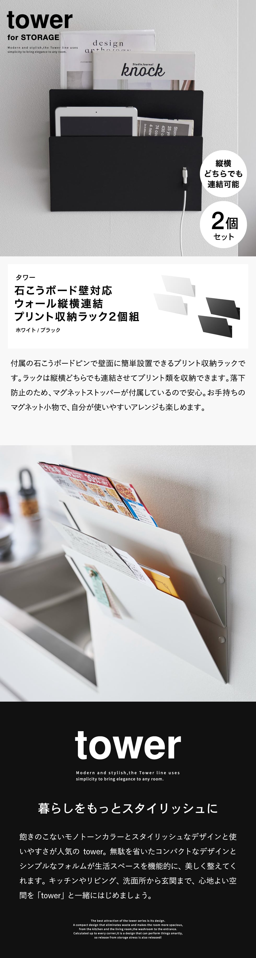 ホワイトとブラックを中心とした飽きのこないモノトーンカラーと、どんなインテリアにもスッと馴染むスタイリッシュなデザイン。そして、とことんシンプルながら、より豊かな暮らしを提案するアイデアがたくさん詰まった、使いやすいアイテムが人気です。無駄を省いたコンパクトなデザインと、シンプルなフォルムが生活スペースを機能的に、美しく整えてくれます。towerのアイテムをライン使いすれば、すっきりとした統一感が生まれ、お洒落でシックな雰囲気を演出します。キッチンやリビング、洗面所から玄関まで揃えたくなるtowerシリーズで、毎日の暮らしを彩る心地よい空間を。