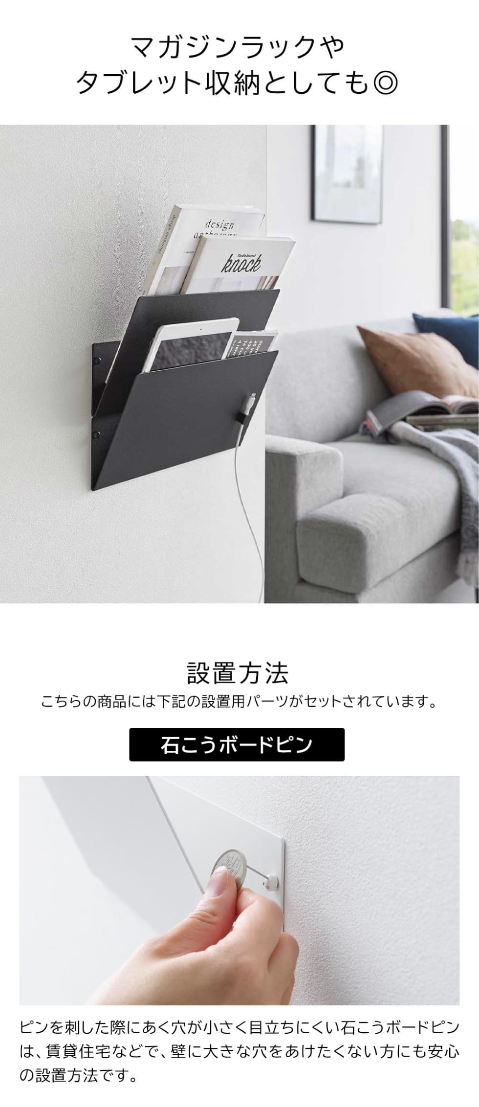 石こうボードピンで簡単取り付け。用途に合わせて縦横お好みの位置に連結させてプリント類を収納できるラックです。雑誌や絵本・プリント類・タブレット端末などの壁面収納に。書類の滑り落ちを防ぐマグネットストッパー付き。お好みの場所に設置できるので、お子様が絵本などを手にとりやすい高さに設置できて便利です。マグネットがつくのでメモなどを貼ることもできます。壁の穴が目立ちにくい石こうボードピンで簡単取り付け。