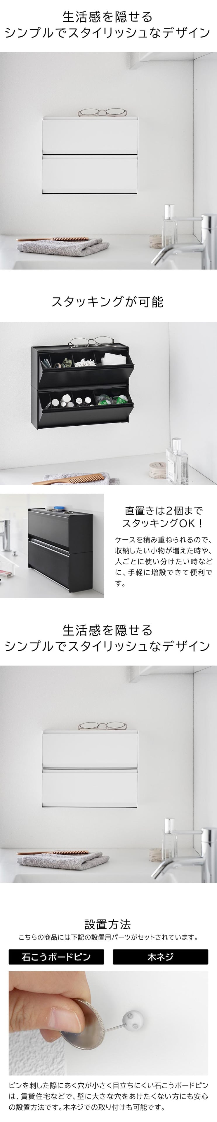 石こうボードピンで壁に付けても置いても使える!洗面小物や化粧品などをスッキリ隠せる収納ケースです。シンプルでスタイリッシュなデザインなので場所を選ばずスマートに設置できます。天板はトレーになっているので小物置きとしても使用可能。ケースはフラップ式なので片手で簡単に開閉でき、整理に便利な可動式の仕切りが3枚付属しています。壁の穴が目立ちにくい石こうボードピンで、浮かせて取り付けられるので衛生的。木ネジでも設置可能。底面にはシリコーンの滑り止めが付いているので、そのまま置いて使用することもできます。スタッキング可能。