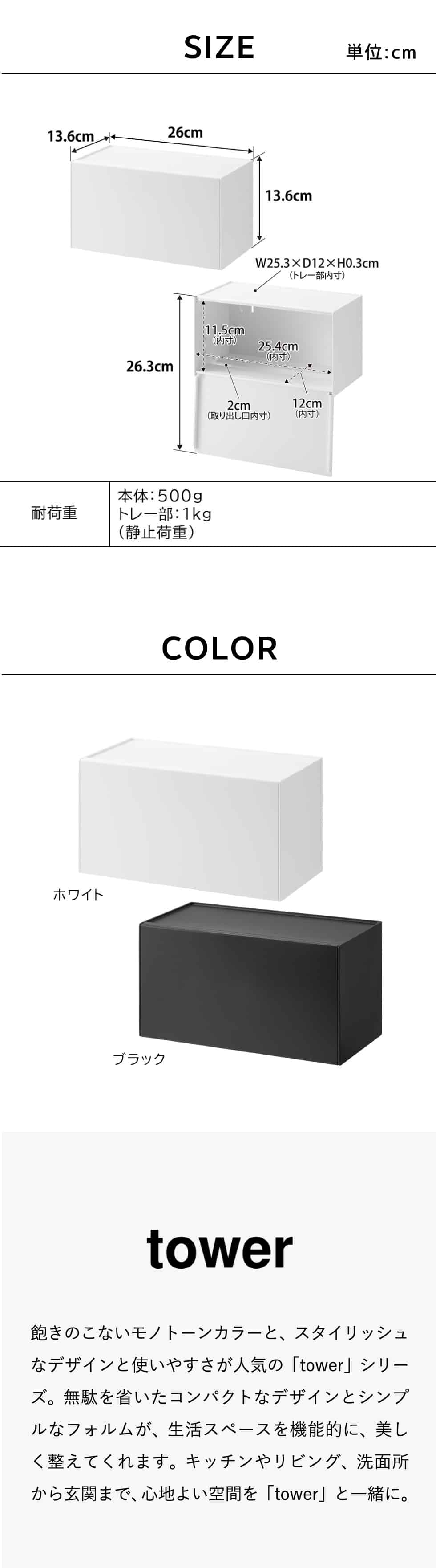 商品サイズ 本体:W26×D13.6×H13.6cm 蓋開口時:H26.3cm フィルムフック接着面:W6×H6cm(1つあたり) |