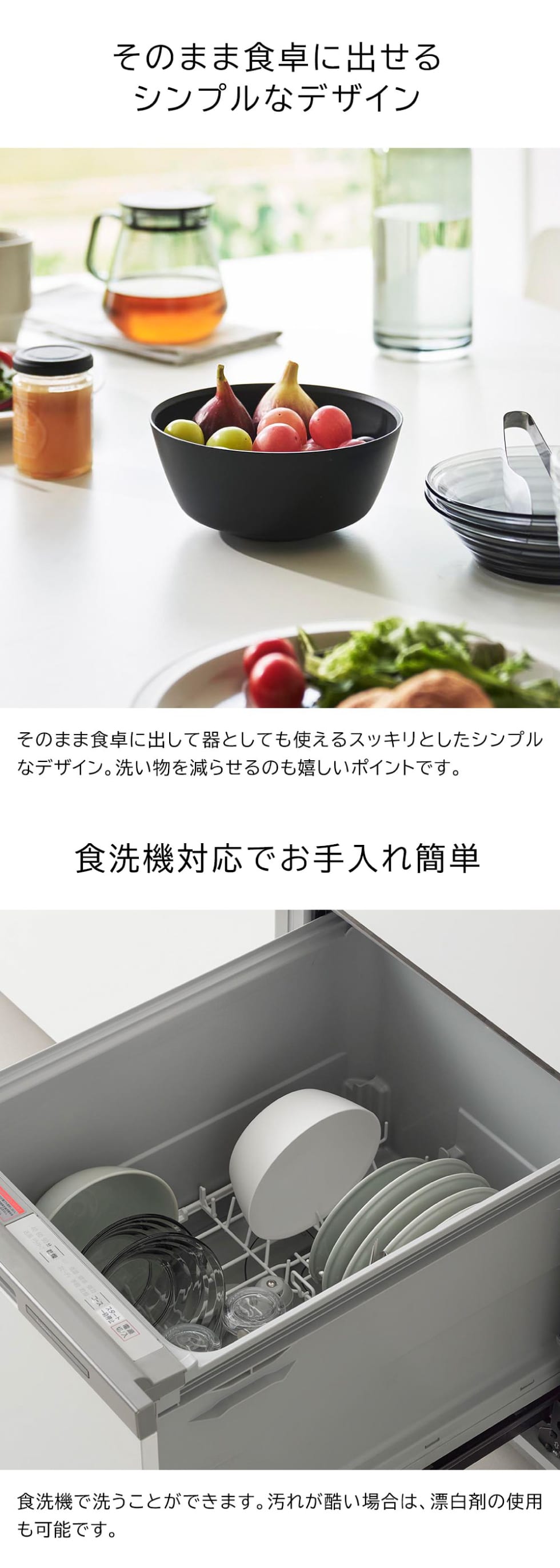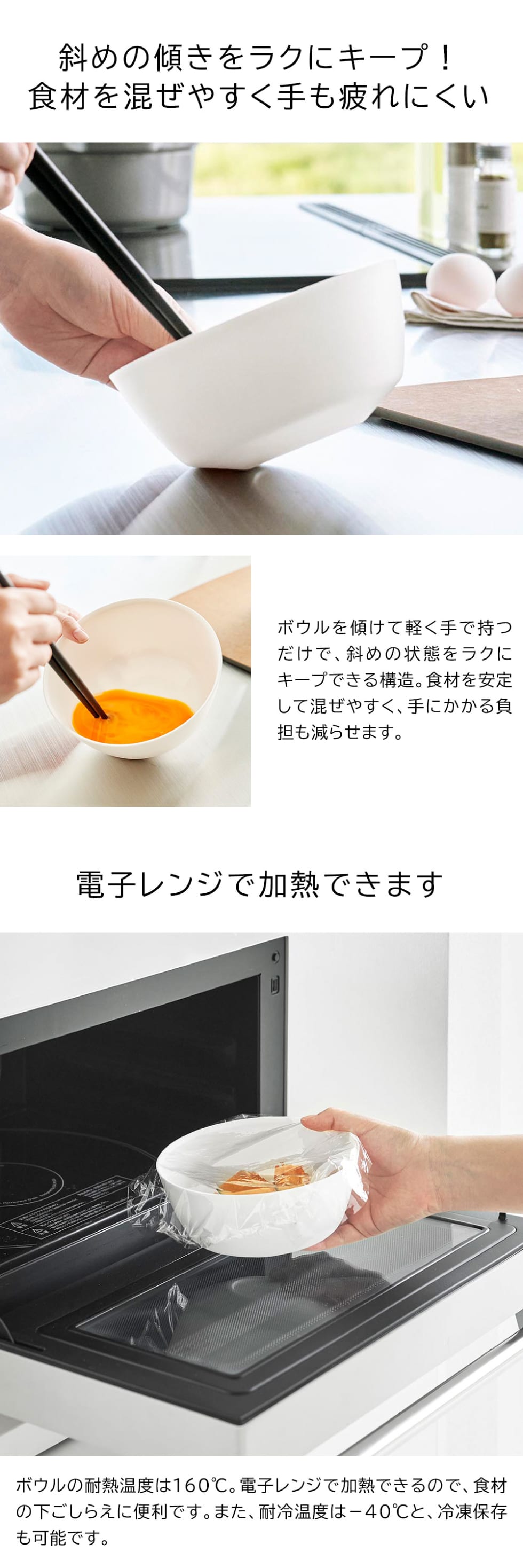 斜めに傾けて軽く手で持つだけで安定して混ぜやすい調理ボウルSサイズ。ボウルを傾けた時に斜めをキープできる構造で、食材が混ぜやすく手が疲れにくいです。食卓にそのまま出して器としても使えるスッキリとしたデザインで、洗い物を減らすことができます。ラップを掛けてそのまま電子レンジOK。温野菜や下ごしらえに便利です。食洗機OK。電子レンジOK。冷凍庫OK。※内容物による