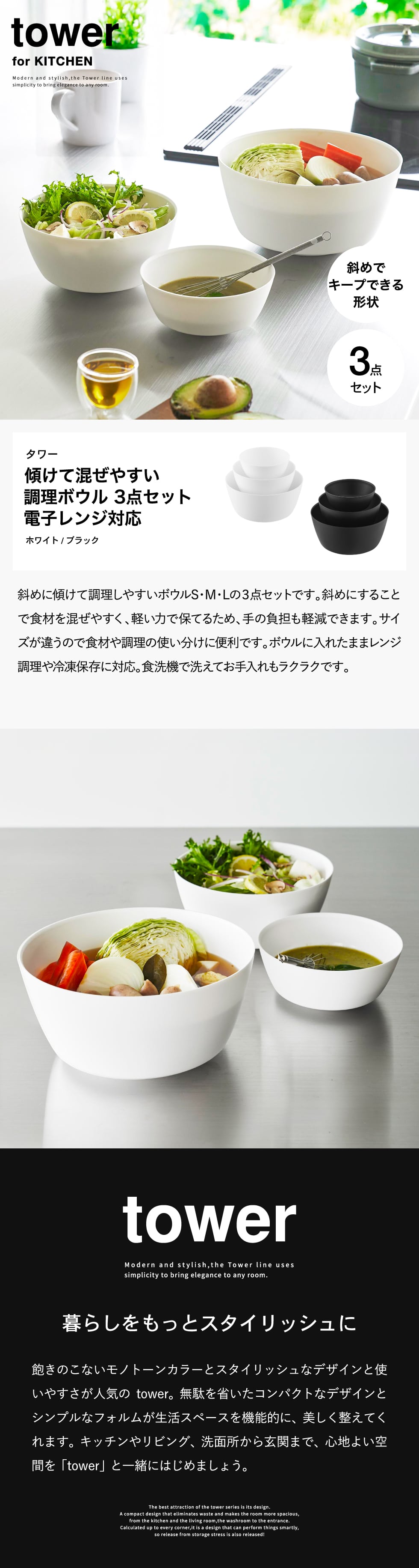 | 傾けて混ぜやすい調理ボウル タワー 3点セット 電子レンジ対応 |