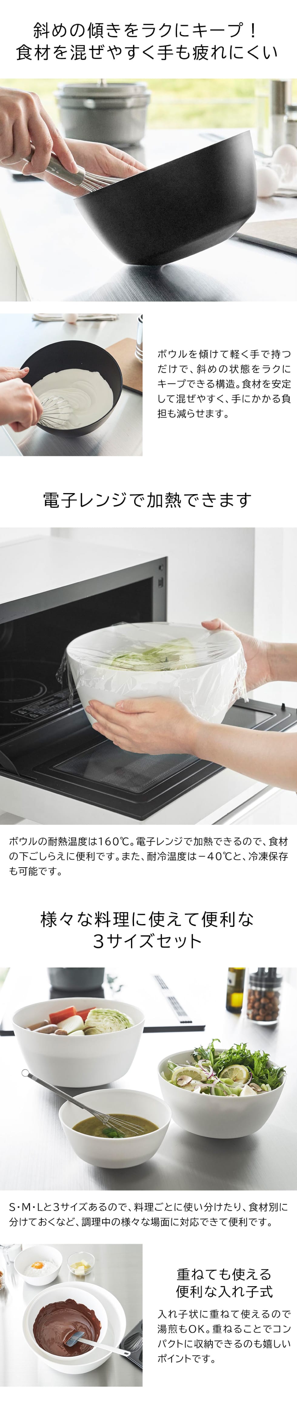斜めに傾けて軽い力で安定する混ぜやすい調理ボウル。組み合わせても使いやすい3サイズセットです。ボウルを傾けた時に斜めをキープできる構造で、食材が混ぜやすく手が疲れにくいです。食卓にそのまま出して器としても使えるスッキリとしたデザインで、洗い物を減らすことができます。ラップを掛けてそのまま電子レンジOK。温野菜や下ごしらえに便利です。食洗機OK。電子レンジOK。冷凍庫OK。※内容物による