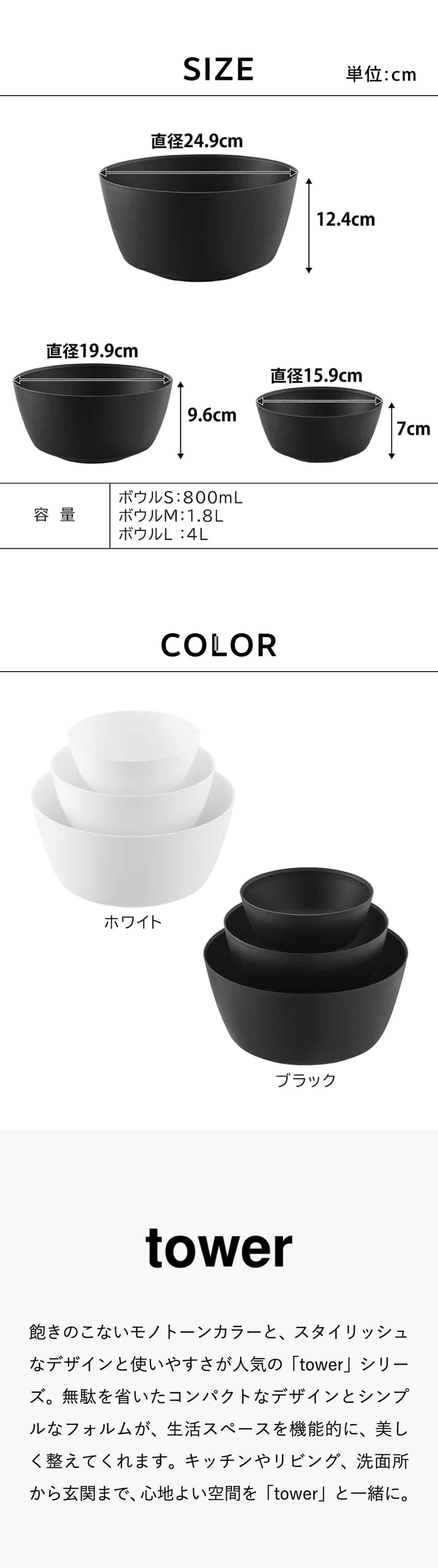 容量 ボウルS:800mL ボウルM:1.8L ボウルL:4L |