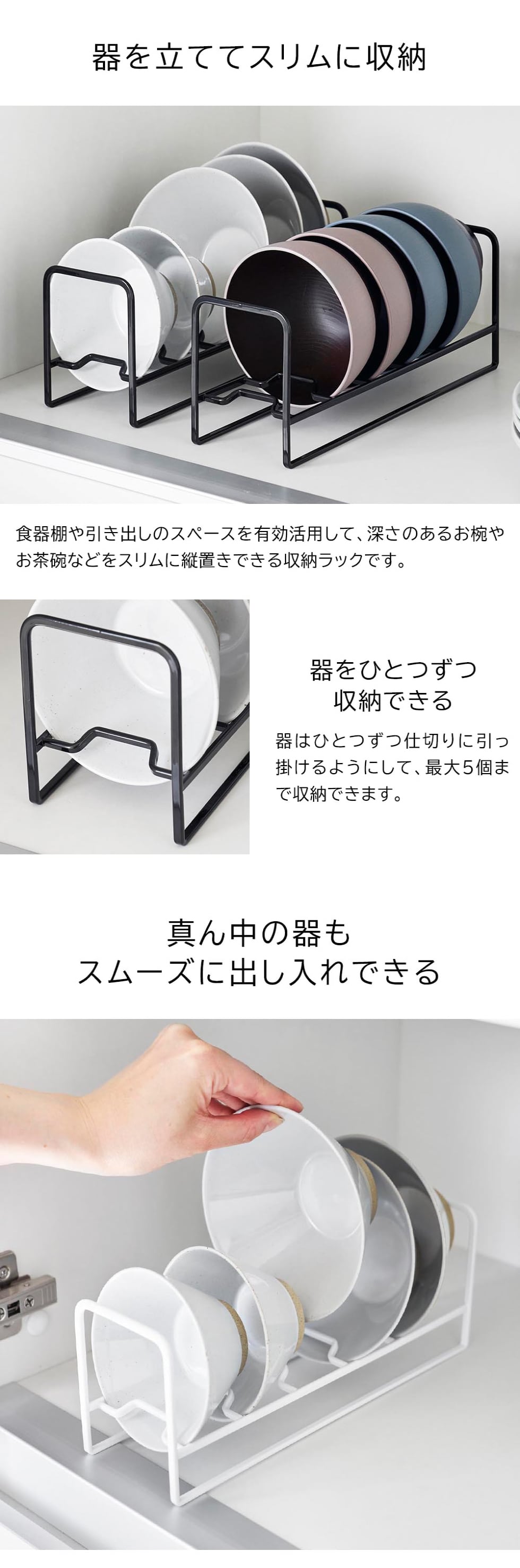 お椀やお茶碗を立てて収納できるラック。スリムなので横幅を取らずに食器棚の奥まで使えます。上から見やすく出し入れしやすいので、引き出し中への設置もおすすめです。