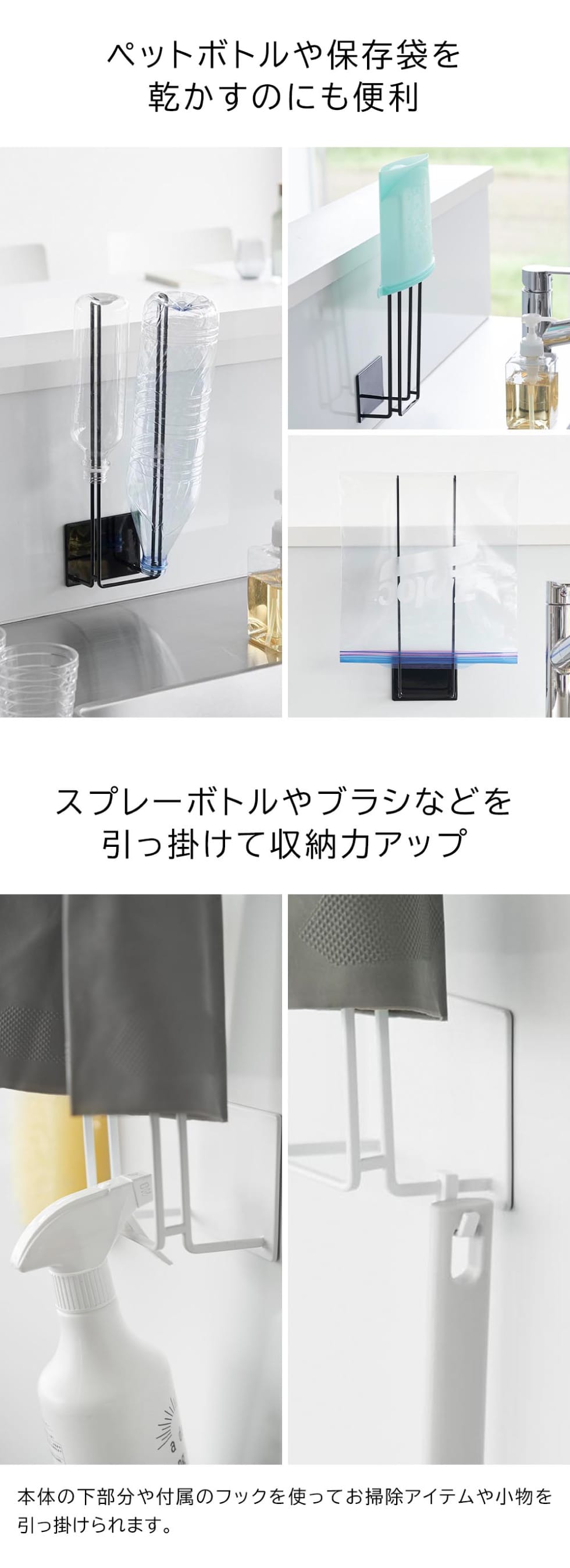 キッチンやバスルームで使用するゴム手袋を乾かしながら収納できるホルダーです。マグネットで簡単に取り付けられてすぐに使えます。保存袋やペットボトルの乾燥にも便利。
