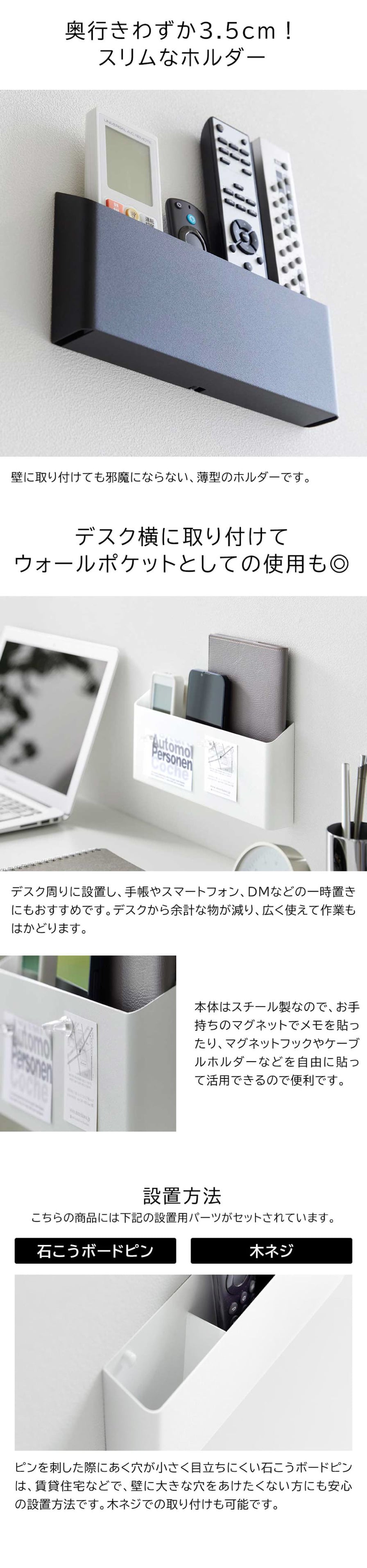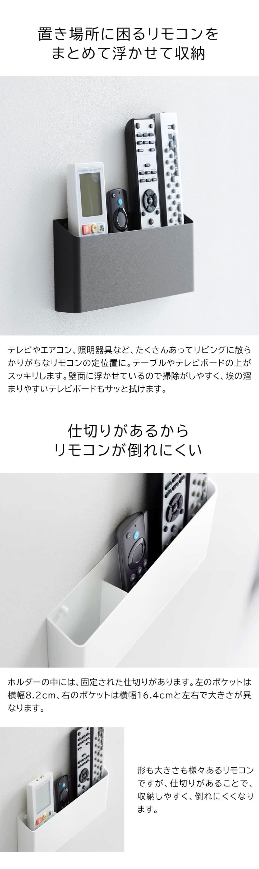 壁に石こうボードピンで簡単に取り付けできるリモコンホルダー。テレビやエアコンなどのリモコンを1か所にまとめてスッキリと収納。置き場所に困るリモコンの定位置をお好みの位置に作ることができます。仕切り付きなので不安定な形状のリモコンも収納しやすいです。スチール製なのでマグネットを使ってメモやDMを貼り付けることもできます。手帳やスマートフォンの一時置きにデスク周りへの設置もおすすめです。壁の穴が目立ちにくい石こうボードピンで簡単取り付け。(木ネジでも取り付け可能) ※マグネットは付属しておりません。