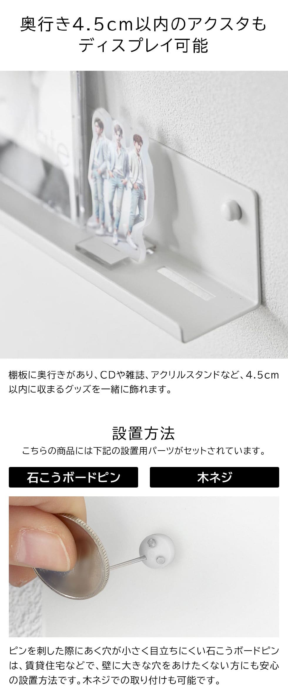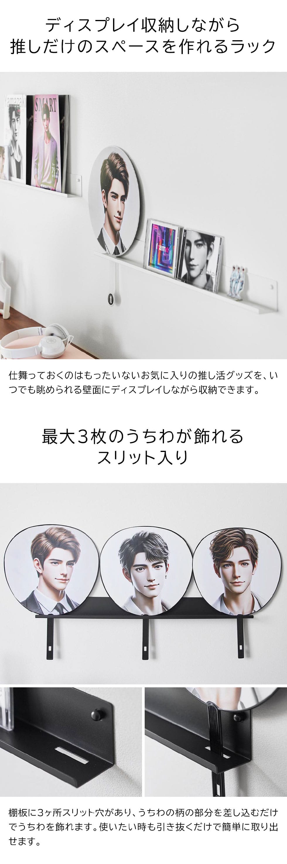 石こうボードピンで簡単取り付け!推し活のグッズを飾りながら収納できるウォールラック。スリット穴があるので、うちわを最大3枚飾れます!差し込むだけで簡単に出し入れできます。奥行き4.5cm以内のアクリルスタンドもディスプレイ可能です。壁の穴が目立たない石こうボードピンで簡単取り付け。(木ネジでも取り付け可能)