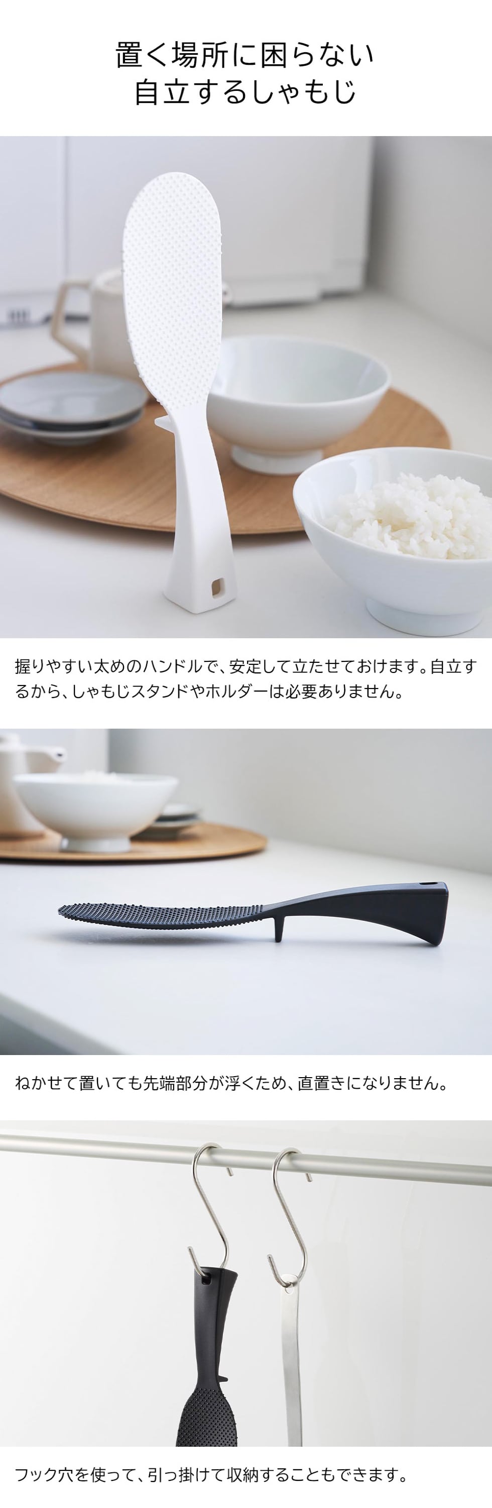 立つ・置く・掛けると便利に収納できるスリムタイプのしゃもじ。すくう面はお米がつきにくいエンボス加工。先端が浮くので直置きにならず衛生的です。幅の狭いお弁当箱にもご飯が入れやすいスリムサイズです。