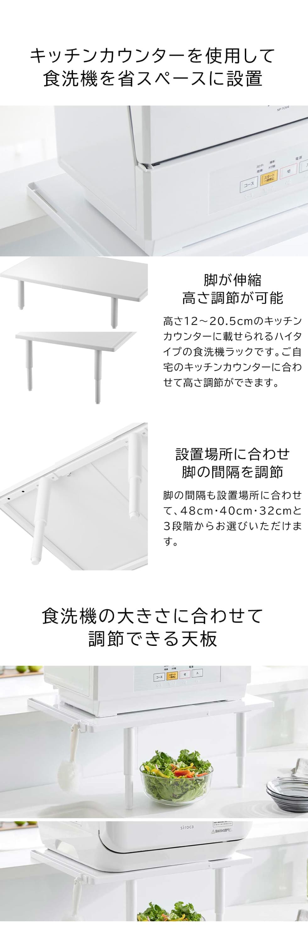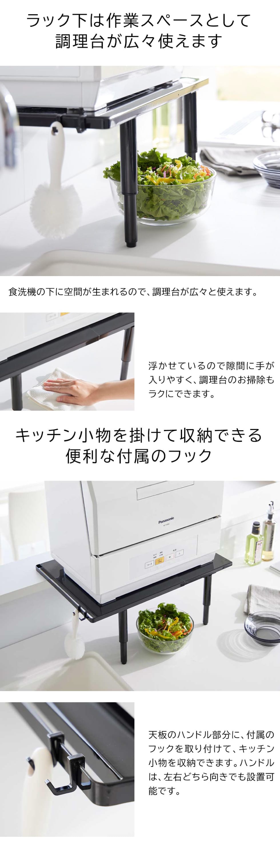 キッチンカウンターに食洗機の後ろ半分を載せて、省スペースに設置することができる食洗機ラックハイタイプです!キッチンカウンターに合わせて脚の高さ調節が可能。設置場所に合わせて脚の間隔も3段階から選べます。天板の幅が伸縮できるので 様々なサイズの食洗機に対応。ラック下も作業スペースとして広々使え、お掃除もラクラク。小物を掛けておくのに便利なフックが付属しています。