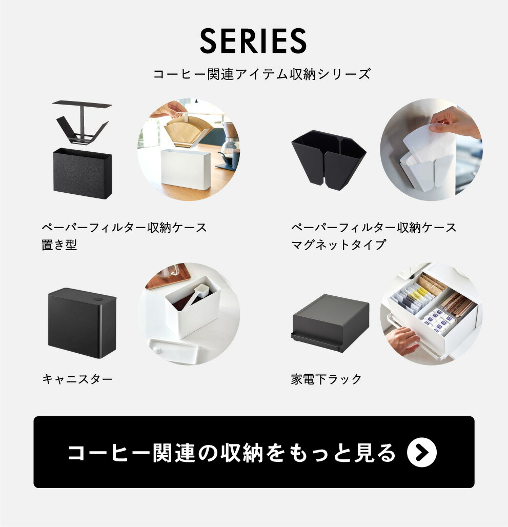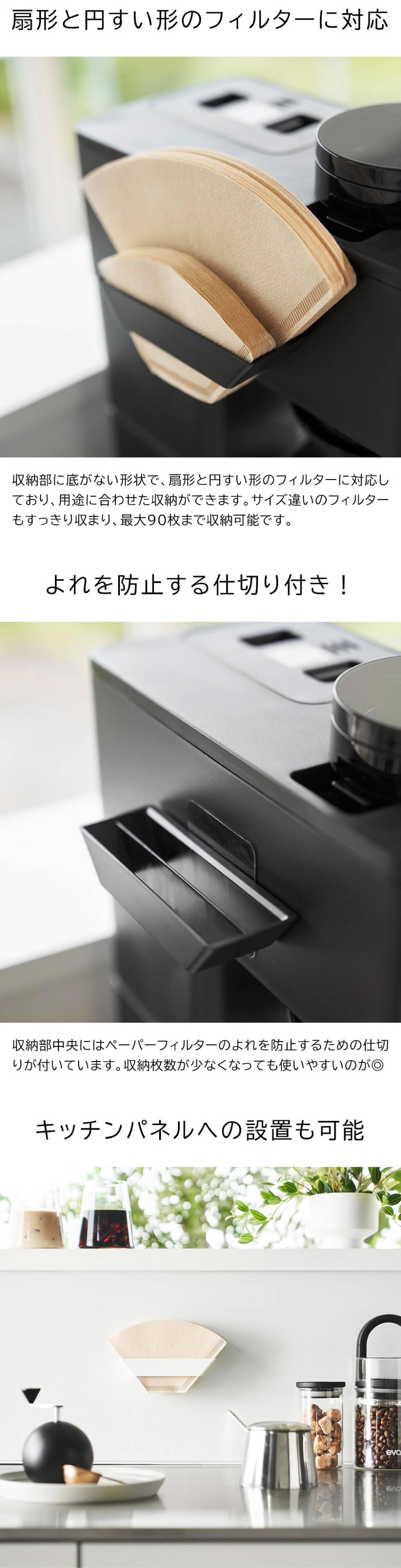 フィルムフックでコーヒーメーカーに直接取り付けられるコーヒーペーパーフィルターストッカー。扇・円すい形に対応しており用途に合わせた収納が可能です。仕切りがあることによりペーパーフィルターのよれを防止します。フィルムフックに掛けるだけの簡単設置。