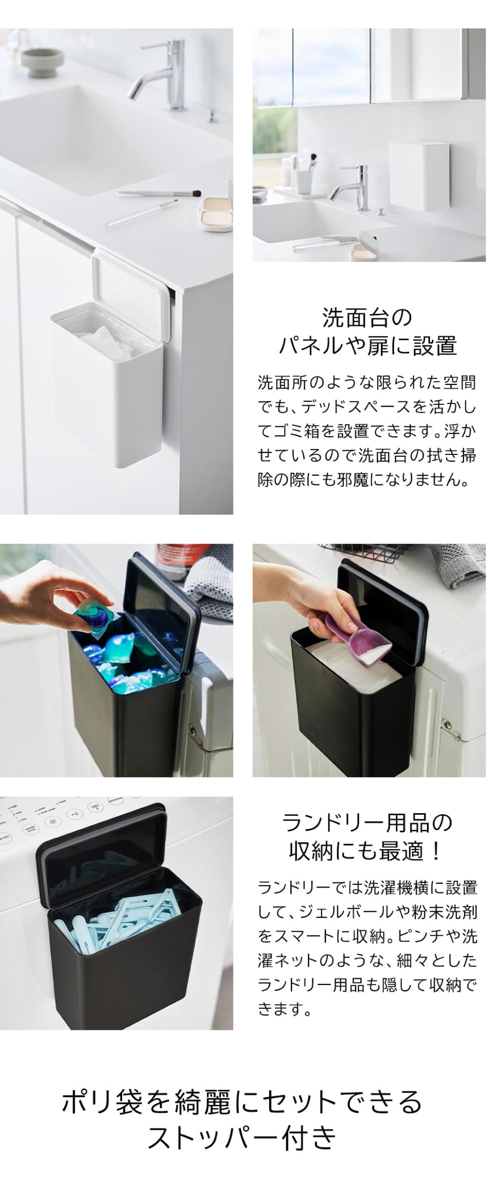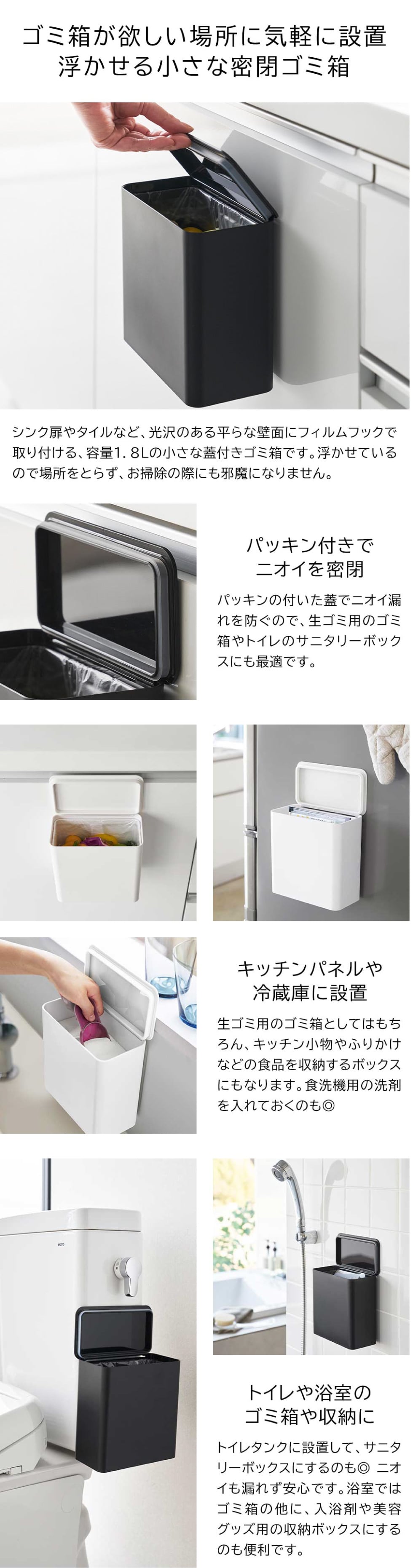 シンク扉や冷蔵庫のガラスドアなどにフィルムフックで簡単取り付け。片手でサッと開けられます。蓋付きなのでゴミが見えずスッキリ。ストッパーがあるので内側にポリ袋を掛けることができます。浮かせて設置できるのでお掃除もラクラク。洗面所やトイレタンクに設置してゴミを捨てるのも便利。パッキン付きなのでニオイも防ぎます。タイルにも取り付け可能。フィルムフックに掛けるだけの簡単設置。