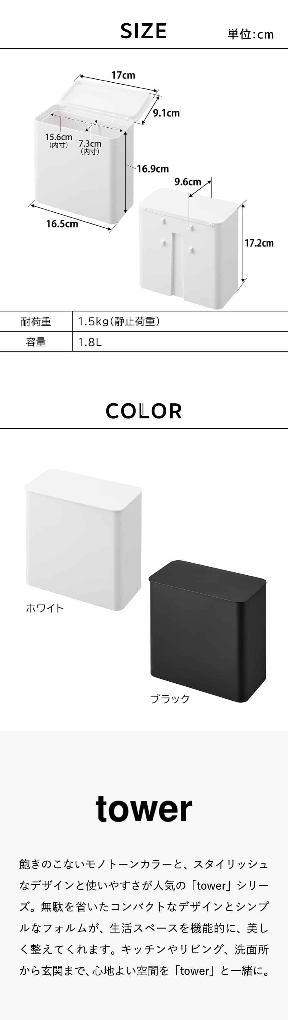 ホワイトとブラックを中心とした飽きのこないモノトーンカラーと、どんなインテリアにもスッと馴染むスタイリッシュなデザイン。そして、とことんシンプルながら、より豊かな暮らしを提案するアイデアがたくさん詰まった、使いやすいアイテムが人気です。無駄を省いたコンパクトなデザインと、シンプルなフォルムが生活スペースを機能的に、美しく整えてくれます。towerのアイテムをライン使いすれば、すっきりとした統一感が生まれ、お洒落でシックな雰囲気を演出します。キッチンやリビング、洗面所から玄関まで揃えたくなるtowerシリーズで、毎日の暮らしを彩る心地よい空間を。