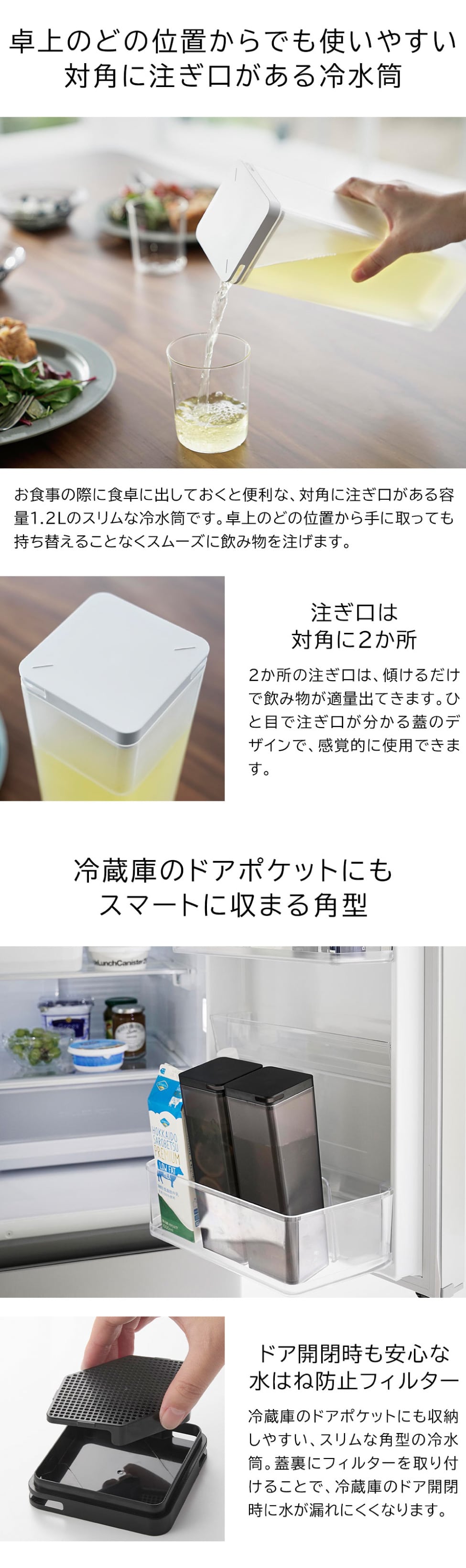 対角に注ぎ口があり、卓上のどの位置からでも持ち替えたりせずにスムーズに注げる容量1.2Lの 冷水ポット。冷蔵庫のドアポケットに収納しやすい角型。安心の水はね防止フィルター付き