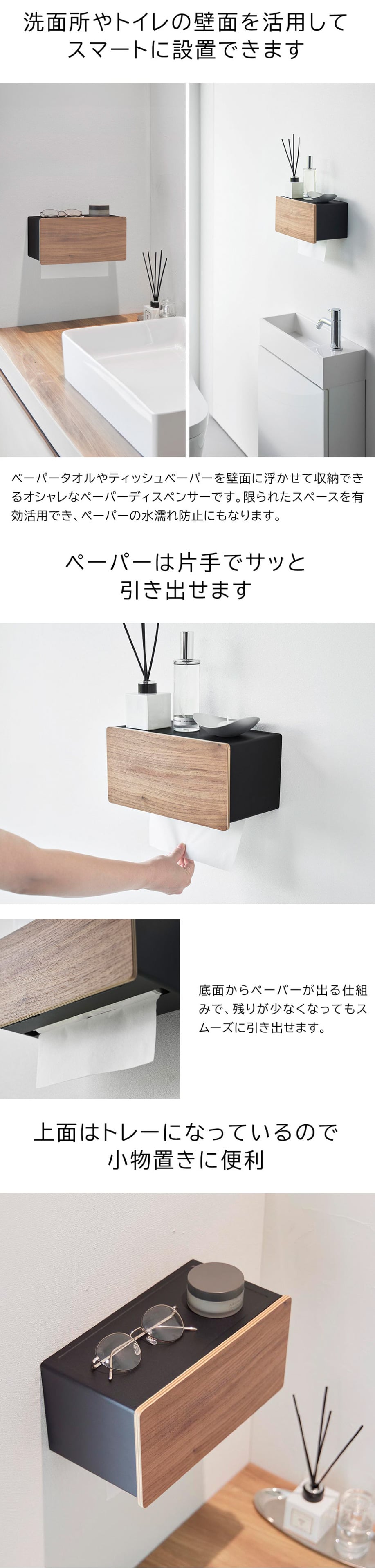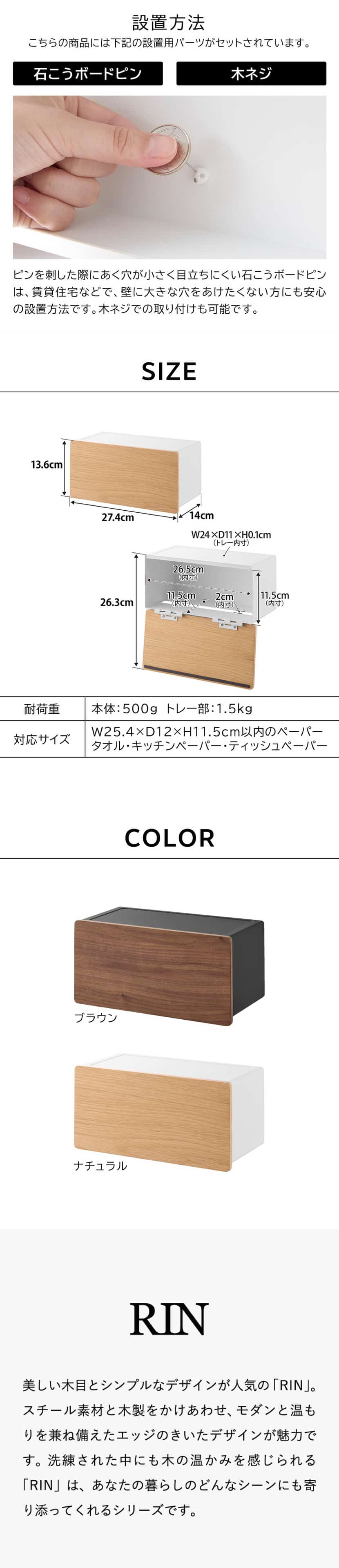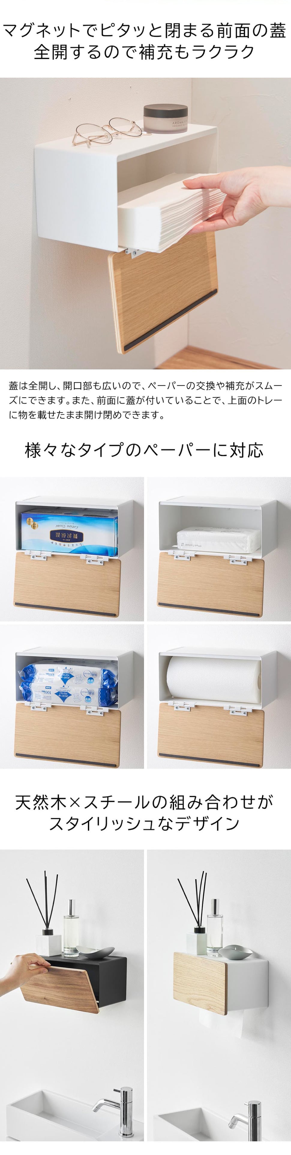 スチールと木の組み合わせが上品なペーパータオルディスペンサーです。ペーパーは片手でサッと取り出しやすく、天板はトレーになっているので小物置きとして使用することができ便利です。前面の蓋が全開するのでペーパーの補充も簡単。ペーパータオル・キッチンペーパー・ティッシュペーパーのボックス、ソフトタイプに対応。壁の穴が目立ちにくい石こうボードピンで簡単に取り付けることができます。木ネジでも取り付け可能。