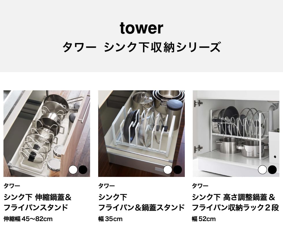 ホワイトとブラックを中心とした飽きのこないモノトーンカラーと、どんなインテリアにもスッと馴染むスタイリッシュなデザイン。そして、とことんシンプルながら、より豊かな暮らしを提案するアイデアがたくさん詰まった、使いやすいアイテムが人気です。無駄を省いたコンパクトなデザインと、シンプルなフォルムが生活スペースを機能的に、美しく整えてくれます。towerのアイテムをライン使いすれば、すっきりとした統一感が生まれ、お洒落でシックな雰囲気を演出します。キッチンやリビング、洗面所から玄関まで揃えたくなるtowerシリーズで、毎日の暮らしを彩る心地よい空間を。