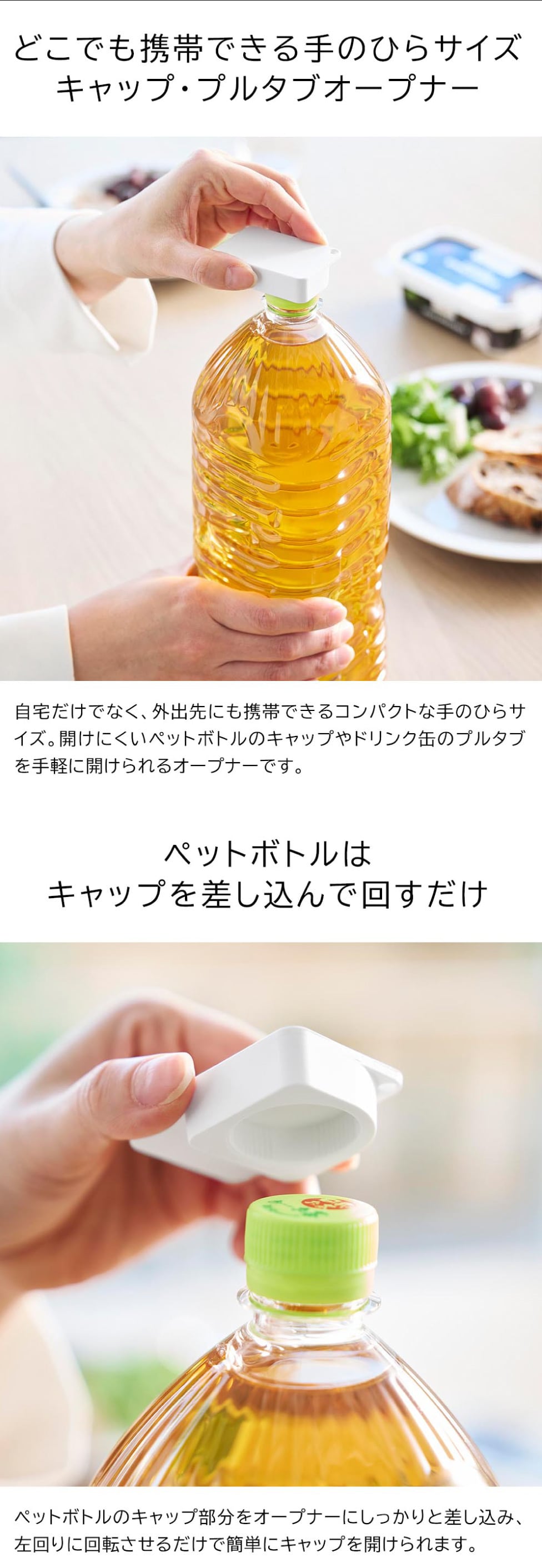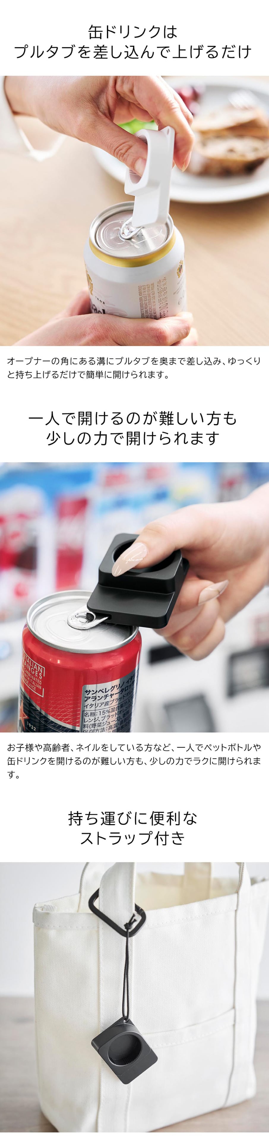 持ち運びサイズで手軽に開けられる!差し込んで回すだけで、簡単に開けることができるキャップ・プルタブオープナーです。