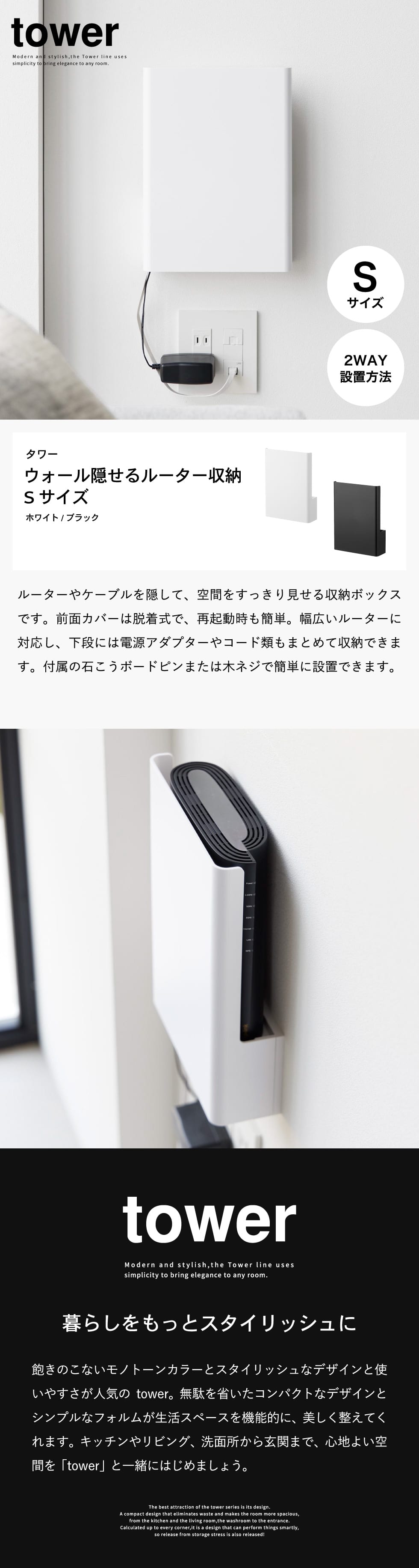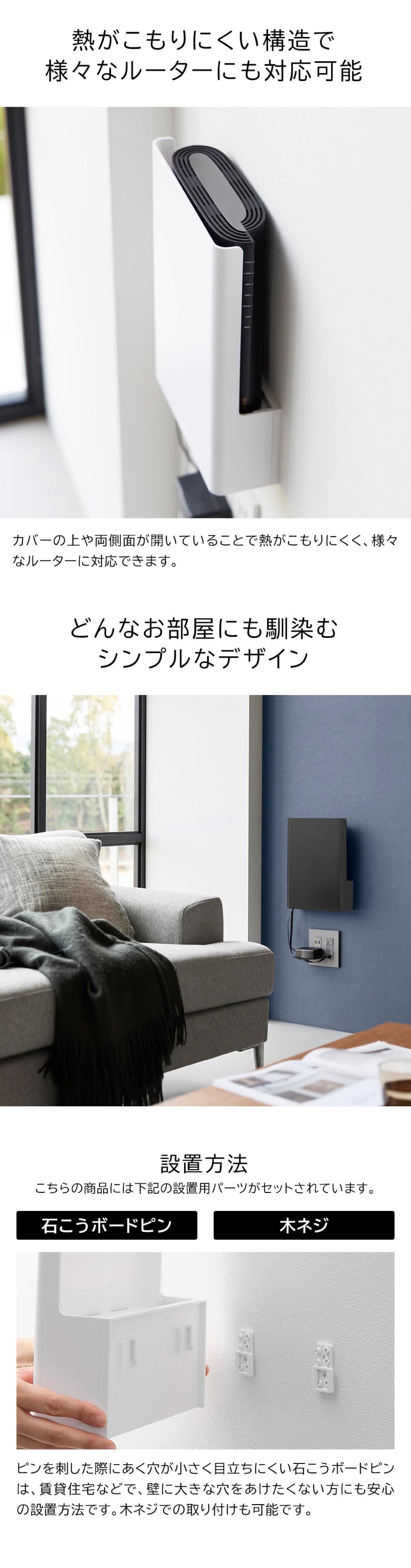 置き場所に困るルーターとケーブルを隠してすっきり収納。インテリアに馴染むシンプルなデザインのルーター収納です。様々なルーターに対応しており、下段には電源アダプターやコード類を収納することができます。前面のカバーは脱着式なので、ルーターの再起動の際にも便利です。石こうボードベースに掛けるだけの簡単設置。