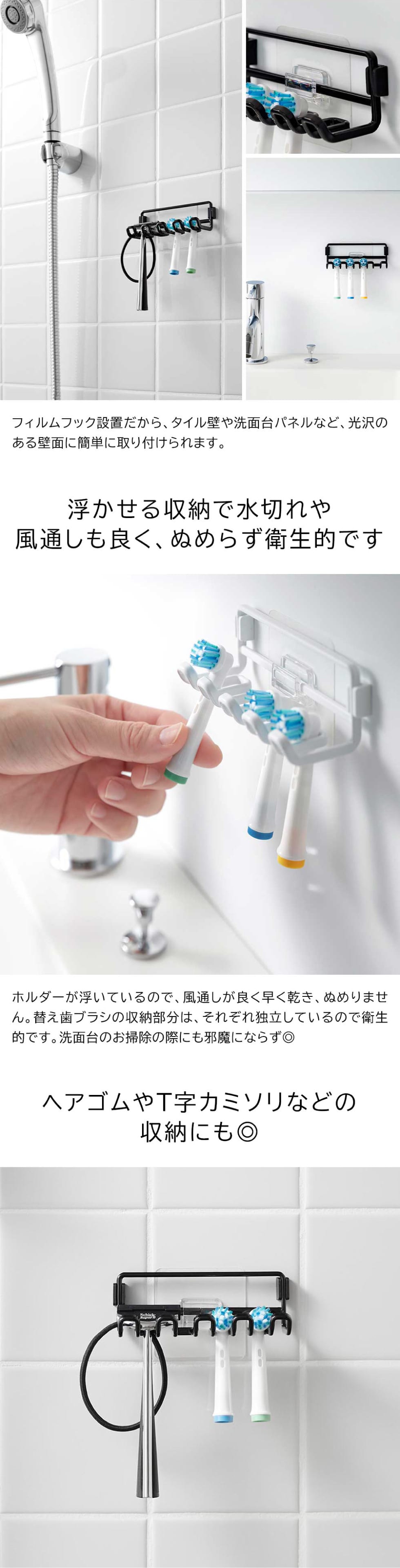 フィルムフックでお好みの位置に簡単取り付けできる替え歯ブラシホルダーです。光沢のある壁面やタイルにも取り付け可能。ヘアゴムなどの小物掛けとしても便利です。