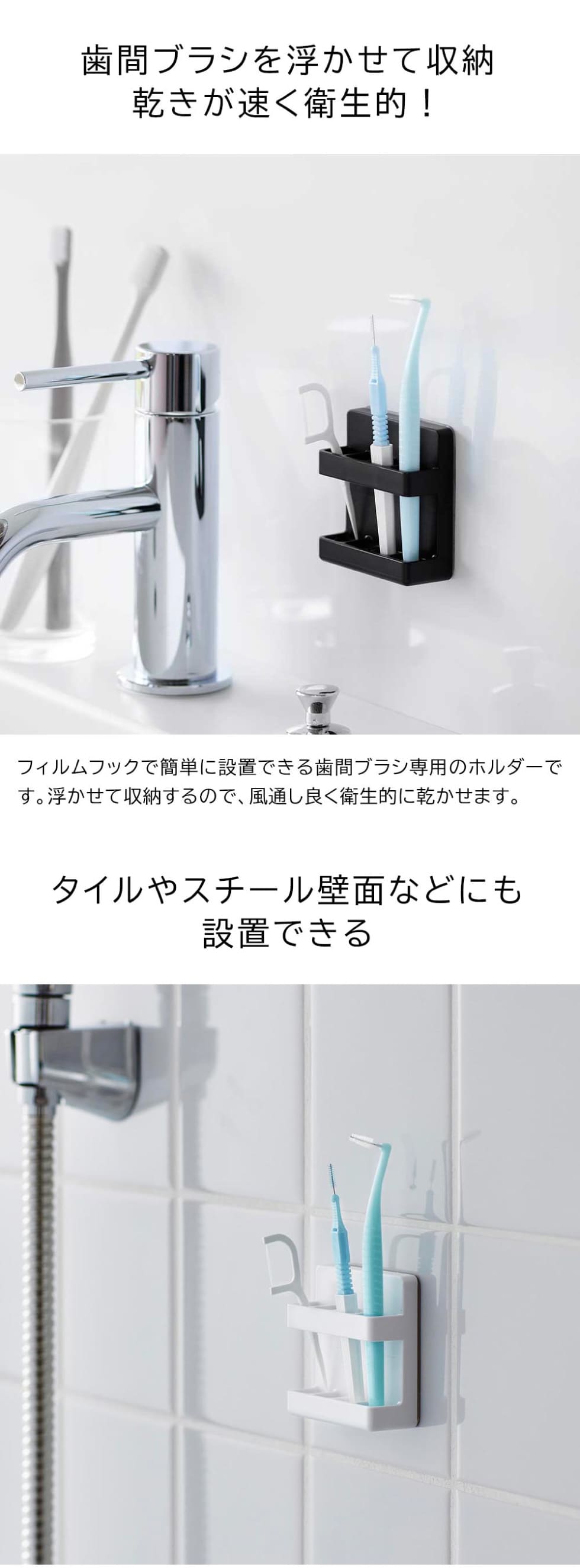 フィルムフックに掛けるだけの簡単取り付け!歯間ブラシを乾きやすく衛生的に収納できるホルダーです。
