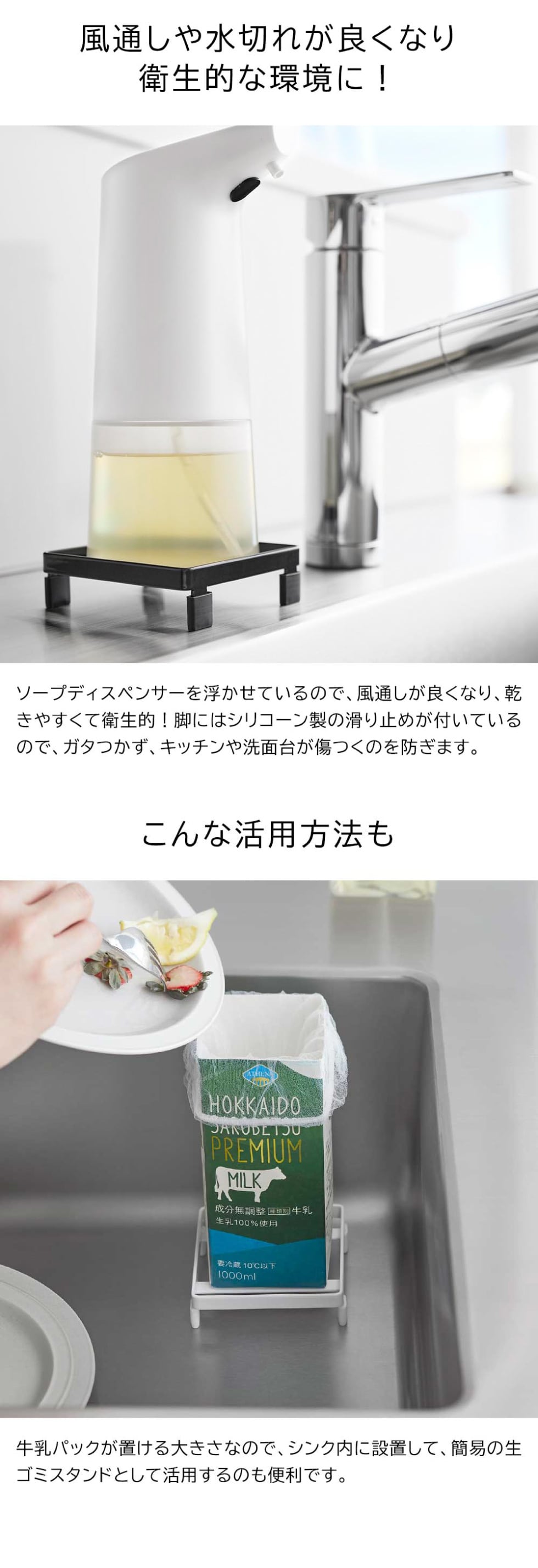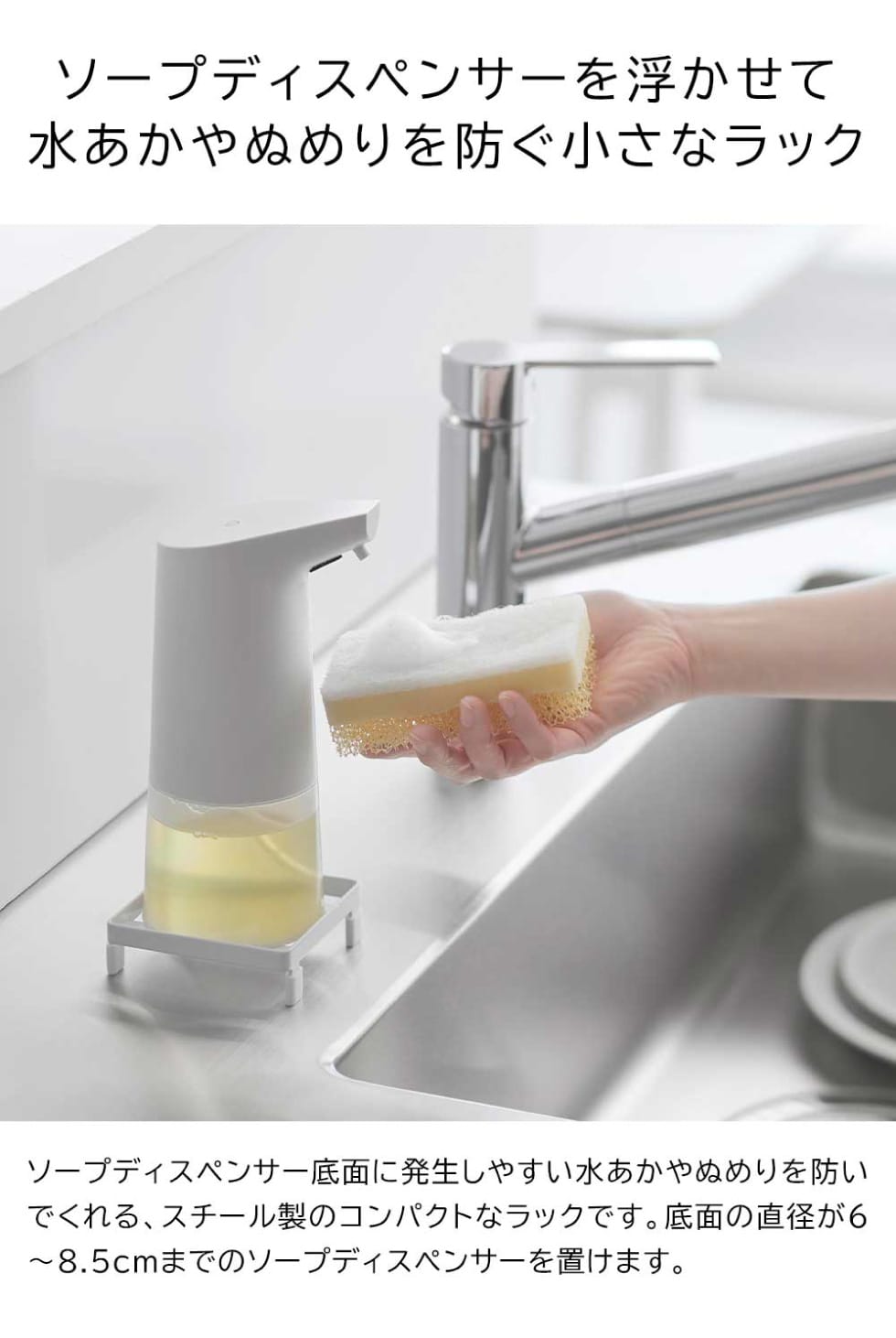 ソープディスペンサー底面の水あかやぬめりを防ぐコンパクトなラック。ソープディスペンサーを浮かせることで、水切れや風通しが良くなり、衛生的に使用できます。