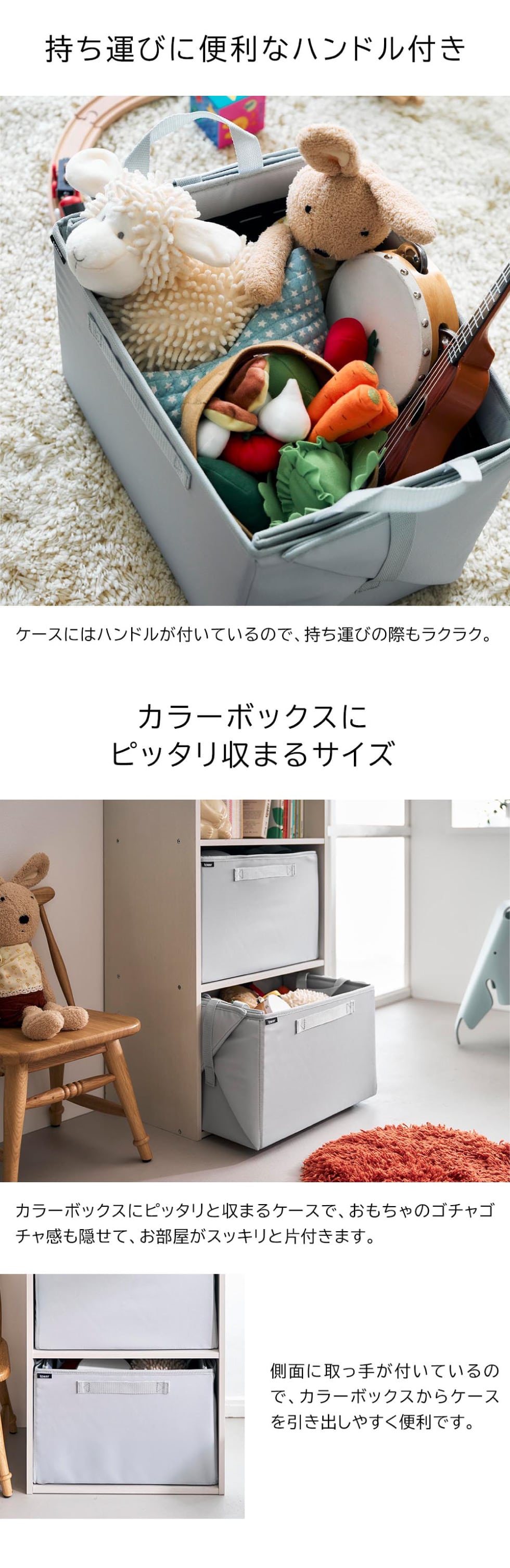 広げればプレイマット、たためばおもちゃを楽しくお片づけできる、遊べるおもちゃ収納ケース。持ち運びに便利なハンドル付き。カラーボックスにピッタリ収まるサイズ。