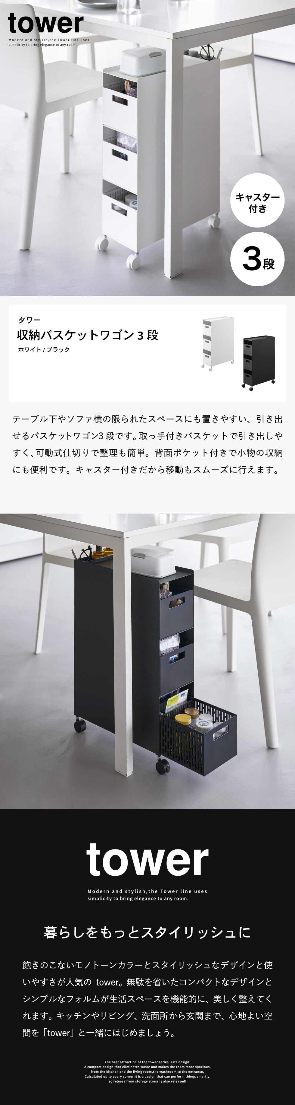 ホワイトとブラックを中心とした飽きのこないモノトーンカラーと、どんなインテリアにもスッと馴染むスタイリッシュなデザイン。そして、とことんシンプルながら、より豊かな暮らしを提案するアイデアがたくさん詰まった、使いやすいアイテムが人気です。無駄を省いたコンパクトなデザインと、シンプルなフォルムが生活スペースを機能的に、美しく整えてくれます。towerのアイテムをライン使いすれば、すっきりとした統一感が生まれ、お洒落でシックな雰囲気を演出します。キッチンやリビング、洗面所から玄関まで揃えたくなるtowerシリーズで、毎日の暮らしを彩る心地よい空間を。