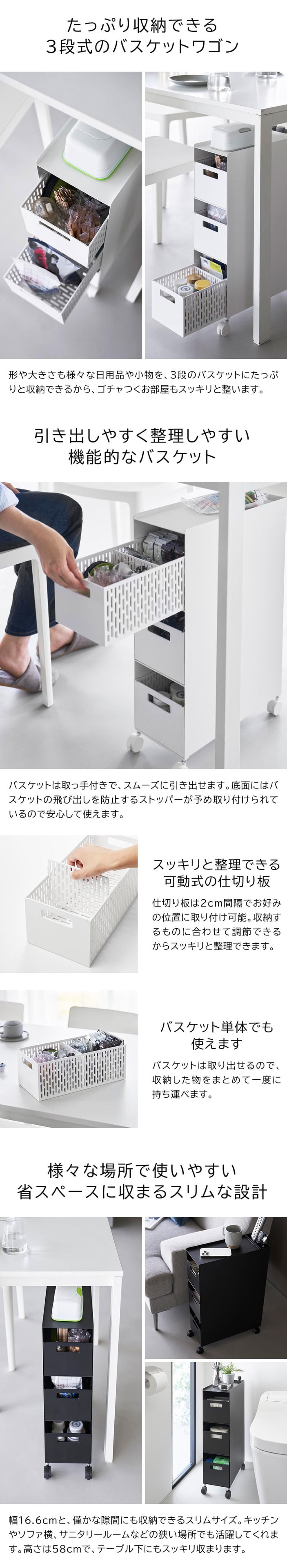 商品サイズ 本体:W16.6×D43×H58cm バスケット:W15.3×D32.1×H12.2cm(1つあたり) |
