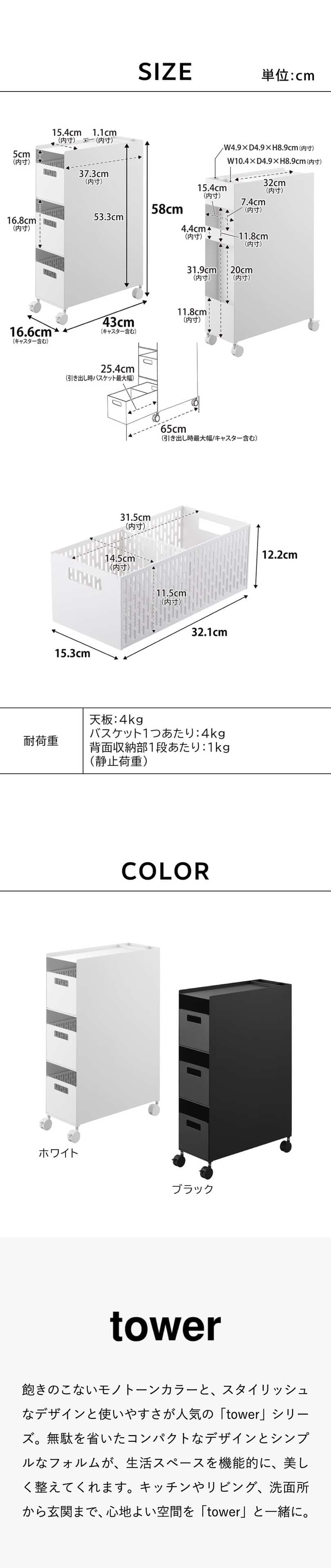耐荷重 天板:4kg バスケット1つあたり:4kg 背面収納部1段あたり:1kg (静止荷重) |