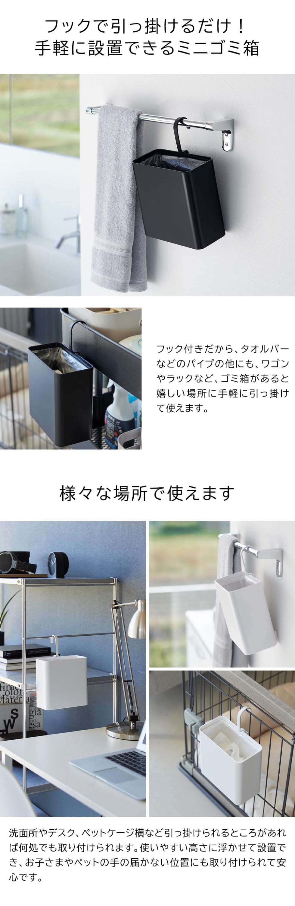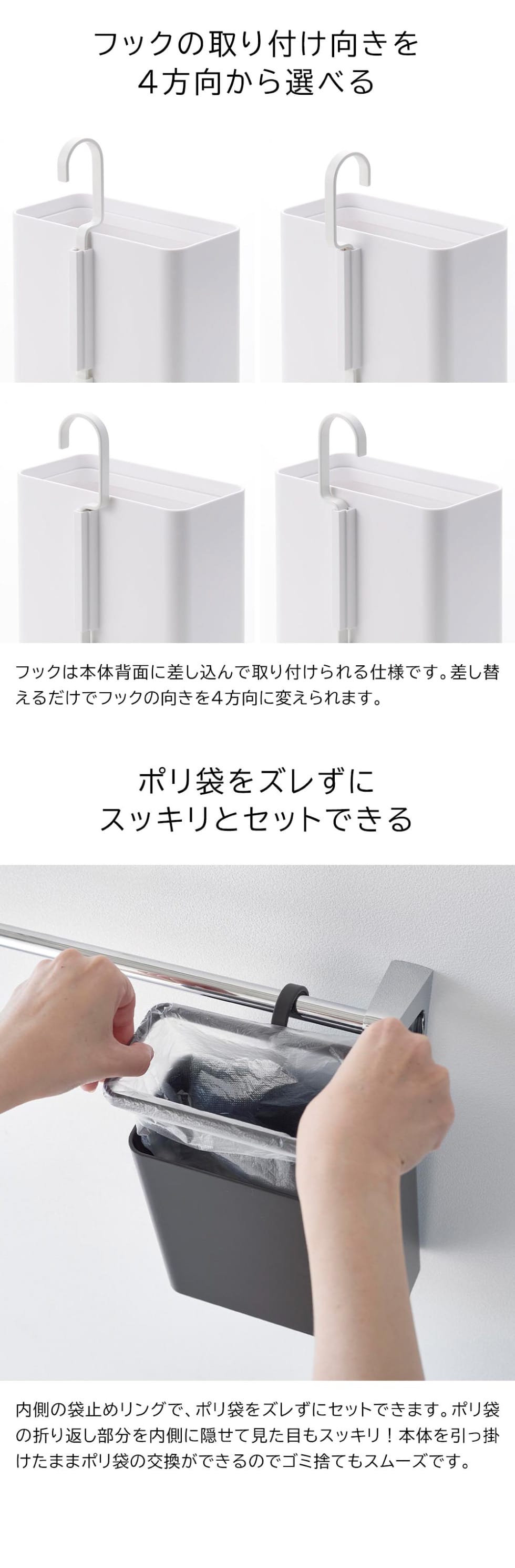 お好みの場所に引っ掛けて設置できるゴミ箱。フックを差し替えるだけで90度ずつ4方向にゴミ箱の向きを変えることができます。リビングや書斎、洗面所のタオルバーやペットケージ、ワゴンなどの設置場所に合わせてお好みの向きに引っ掛けてられるので便利。袋止めリングがあるので内側にポリ袋を掛けることができます。
