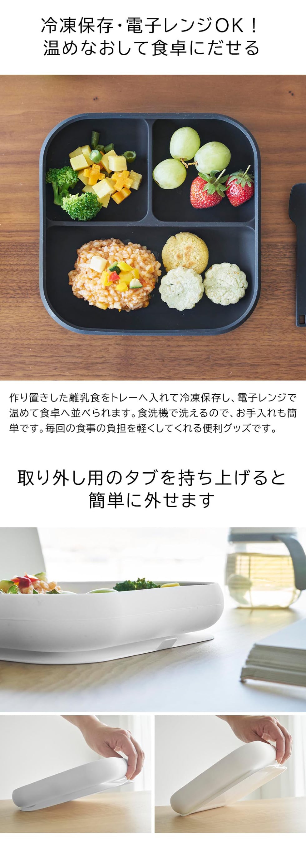 吸盤付きで仕切りがあり、トレーのフチに返しがあるのでスプーンですくいやすく、こぼれにくいシリコーン製のベビーフードトレーです。シリコーン製でしっかり吸着するので、手づかみ食べの時期のお子様にもおすすめです。取り外し用タブを持ち上げると吸盤が外れます。食洗機OK。電子レンジOK。冷凍庫OK。