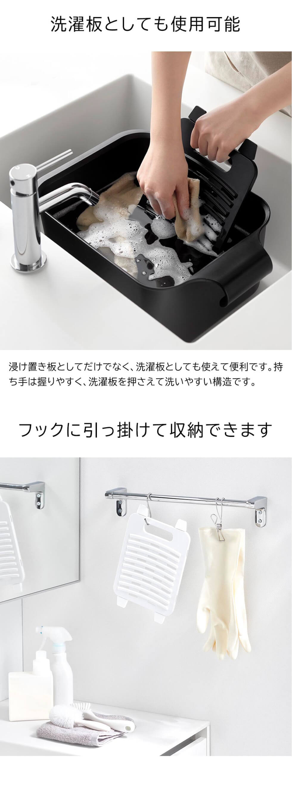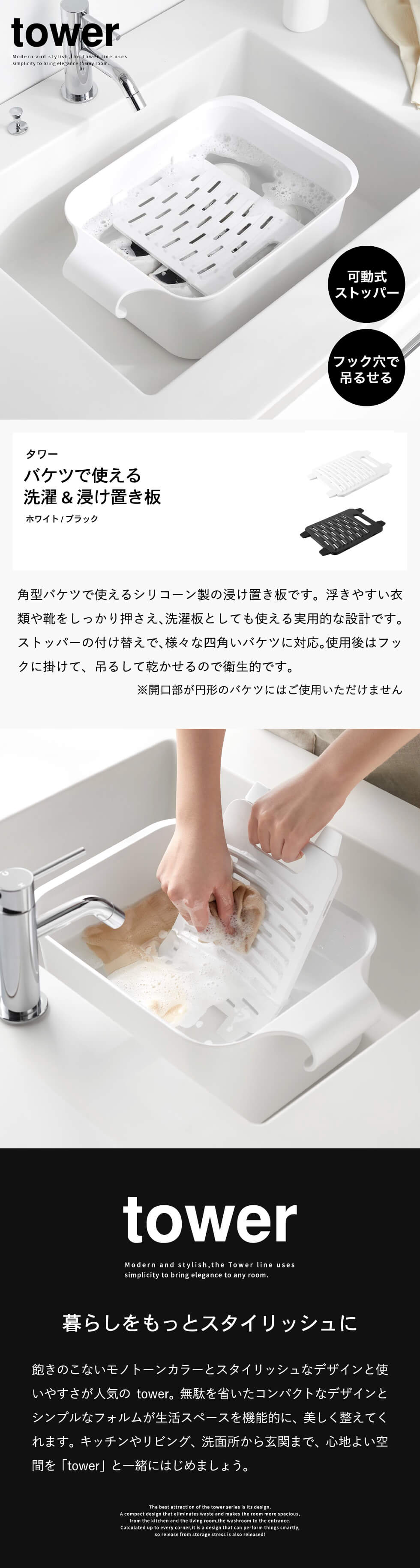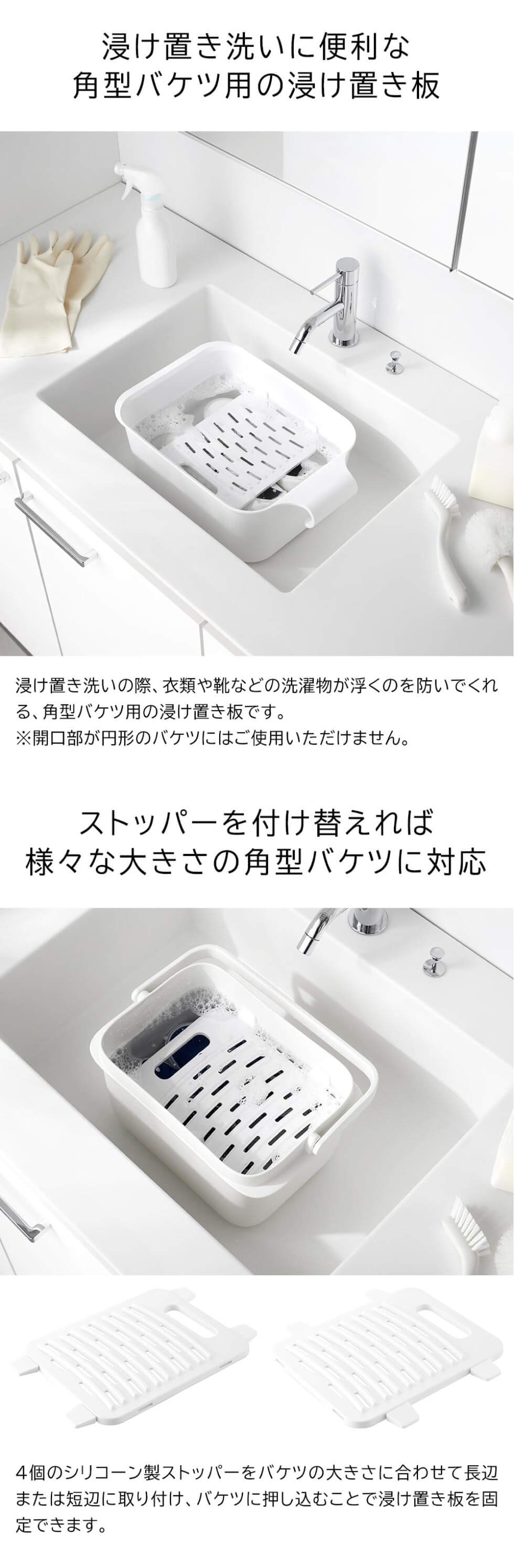 シリコーン製のストッパーを付け替えることで、様々な四角いバケツに取り付けることができる浸け置き板です。衣類や靴が浮くのを防ぎ、洗濯板としても使用可能!持ち手部分は握りやすく、洗いやすい構造です。ご使用後はお手持ちのフックに引っ掛けて収納できます。※バケツは別売の「1832/1833 マグネット&引っ掛けバケツ タワー 7.5L」「4208/4209 フタ付バケツ タワー 12L」に対応しております。