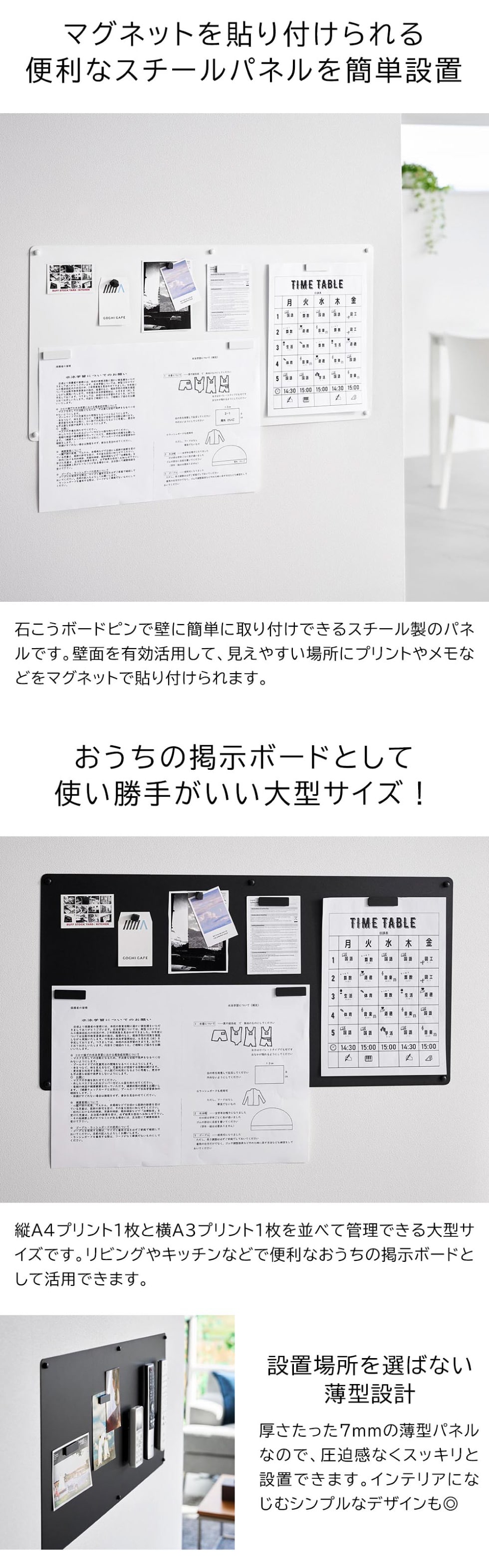 石こうボードピンで簡単に取り付けできるマグネット対応のスチール製プリントパネルです。見えやすい場所に縦A4プリント1枚と横A3プリント1枚を並べて管理することができる大型タイプです。リモコンにお手持ちのマグネットを貼り付けてリモコン収納パネルとしての使用や、玄関に設置してお手持ちのマグネットフックを付けて鍵の収納スペースとしての使用もおすすめです。設置場所や用途に合わせて縦横お好みの向きに取り付けが可能です。付属のマグネットが4個付き。壁の穴が目立ちにくい石こうボードピンで簡単取り付け。木ネジでも取り付け可能。