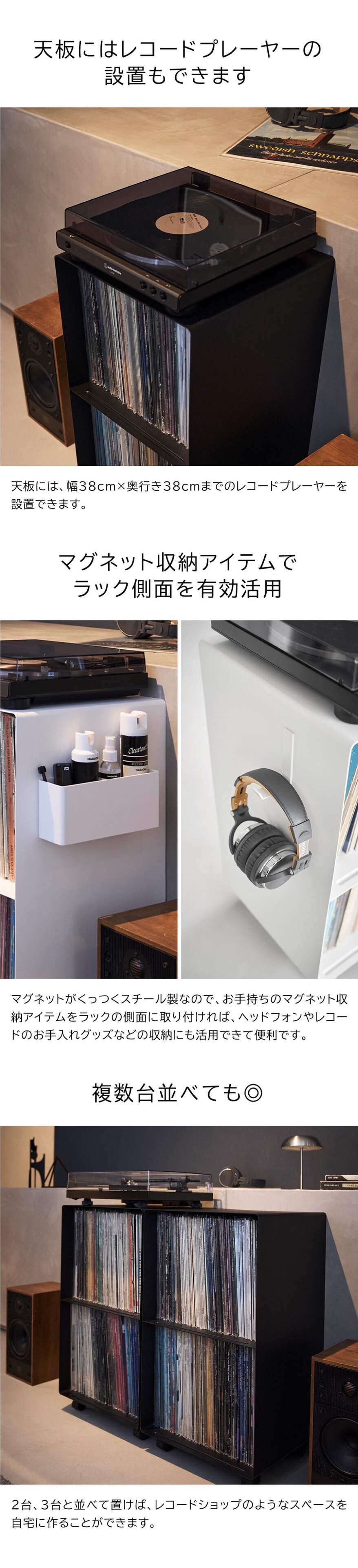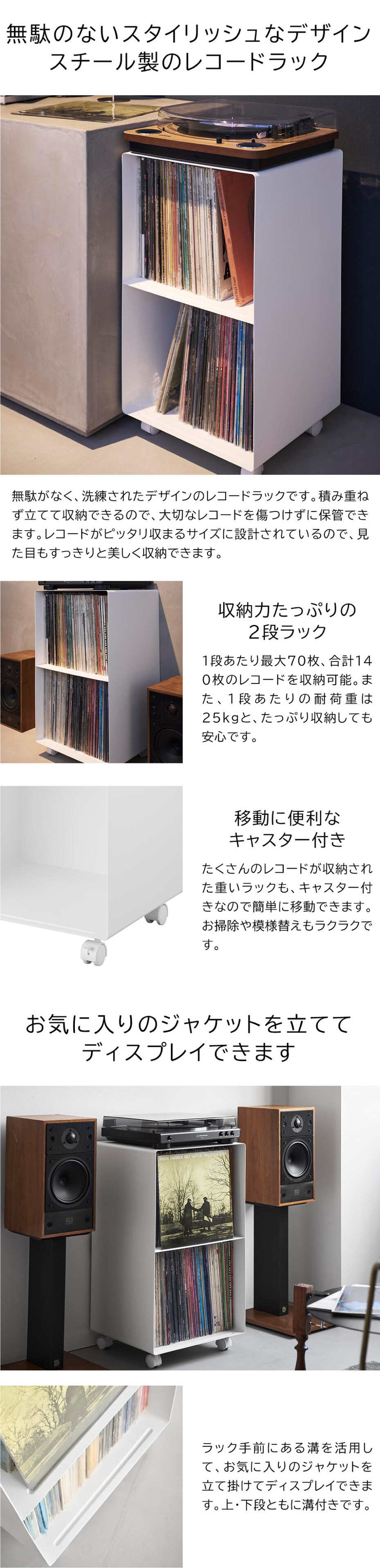 スチール製のキャスター付きレコードラックです。上段、下段棚ともに、お気に入りのレコードジャケットを立ててディスプレイできる溝があり、1段あたり最大70枚まで収納可能。※レコードのサイズや厚さ、形状によっては収納できない場合もあります。天板には幅38×奥行き38cmまでのレコードプレーヤーを設置することができます。2台並べて使えば、さらに収納力アップ。スチール製の側面には、別売りのマグネット収納が取り付け可能。お手入れアイテムの収納や、お気に入りのポスターのディスプレイにも便利です。