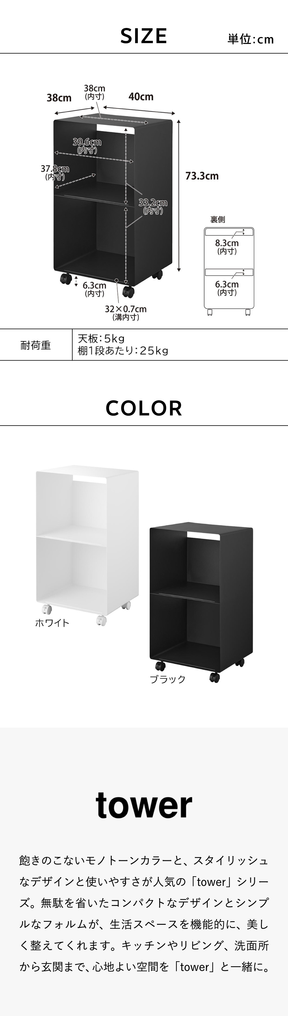 耐荷重 天板:5kg 棚1段あたり:25kg (静止荷重) |