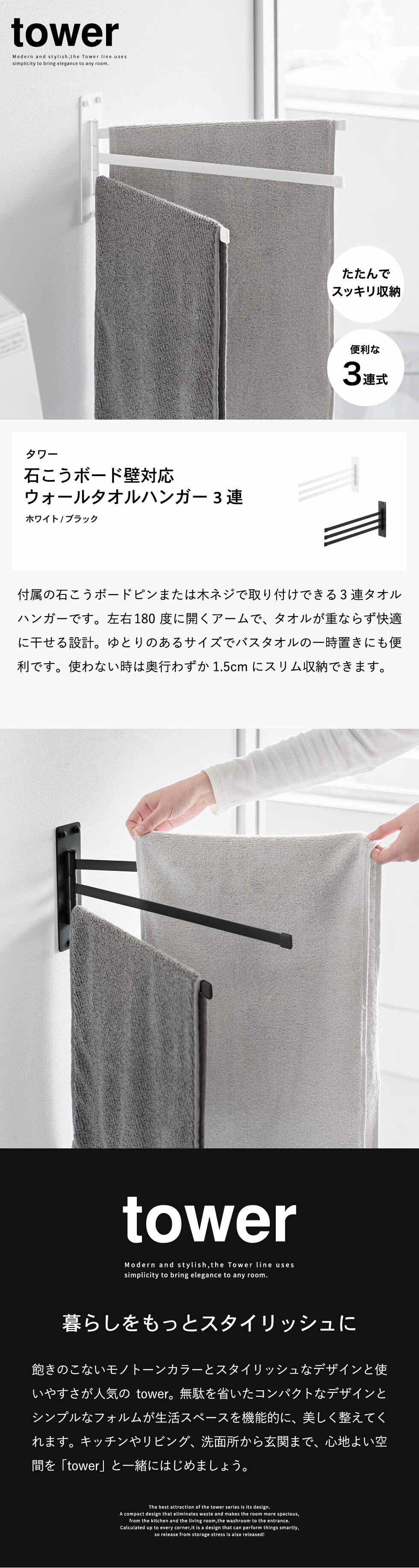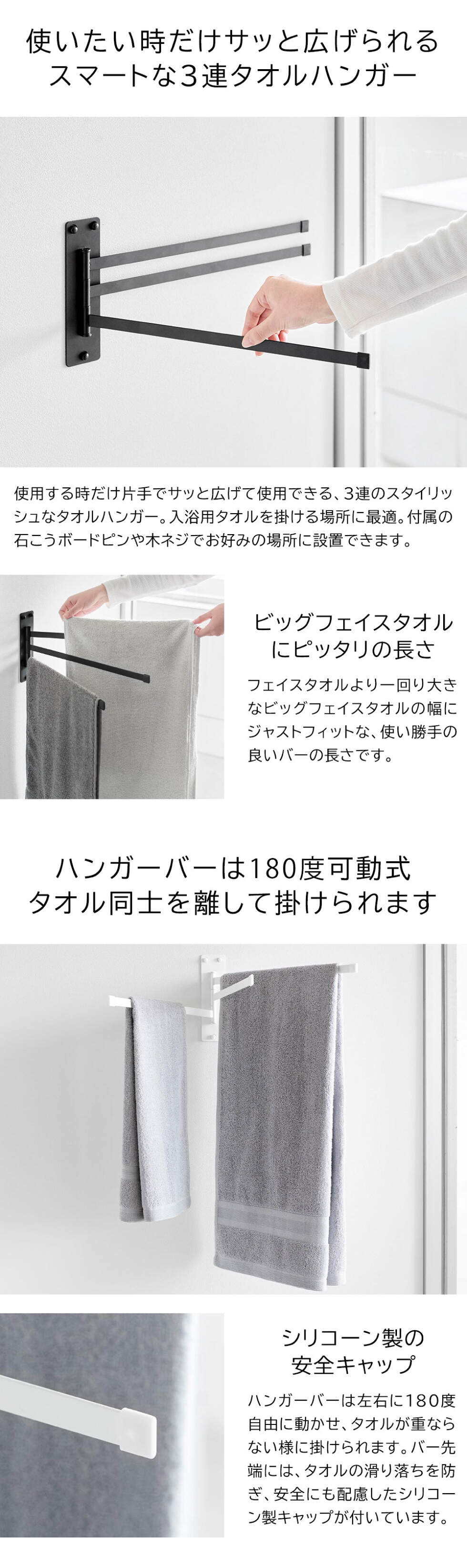 石こうボードピンで壁に簡単取り付け!使わない時はスリムに収納できる室内物干し3連タオルハンガーです。ハンガー部は180度左右に大きく開くため、タオル同士が重ならず、サッと掛けることができます。ビッグフェイスタオルがピッタリ干せるサイズ感で、お風呂上がりのバスタオルの一時置きとしても便利です。奥行きが1.5cmとスリムに収納できる設計で、ハンガー部は左右どちら側にも収納可能。壁の穴が目立ちにくい石こうボードピンで簡単取り付け。木ネジでも取り付け可能。