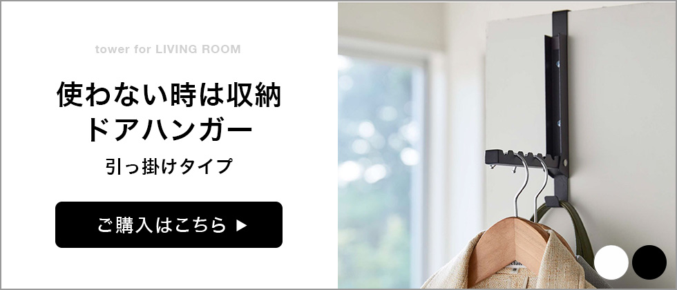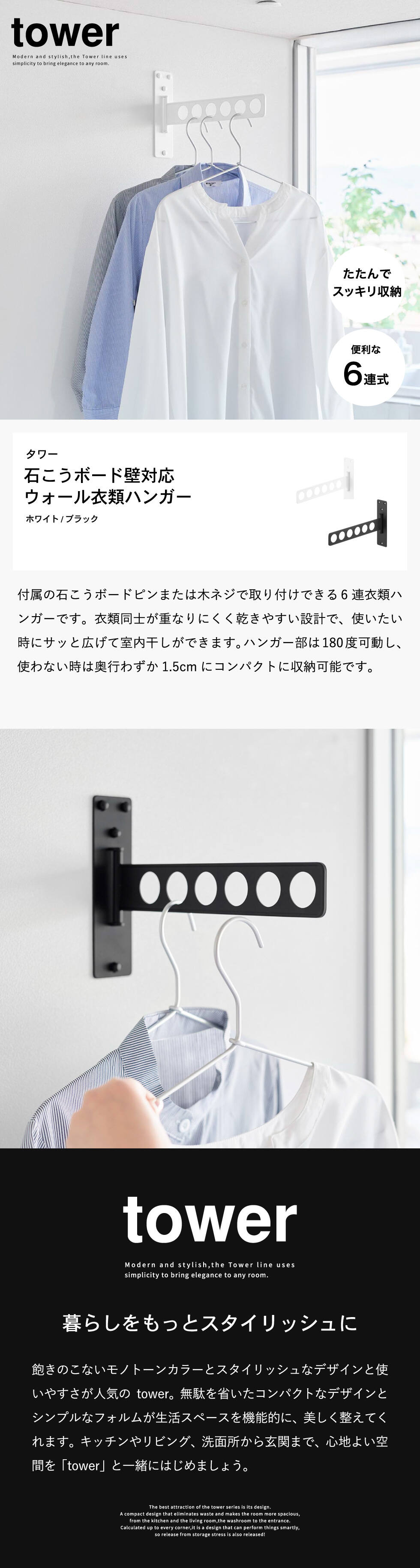 使いたい時だけサッと広げて、使わない時はペタンと畳んでスリムに収納。壁面に付属の石膏ボードピンで設置する6連衣類ハンガー。 タワーシリーズ